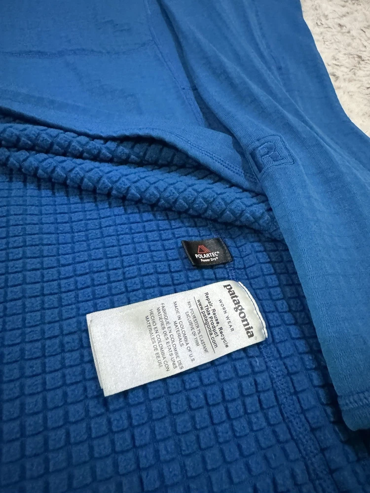 Patagonia R1 3/4 Zip Pullover jacket. Jewel Blue color. Size Large. Good condition. *hole on the sleeve* see photos for details and measurements. message with any questions.