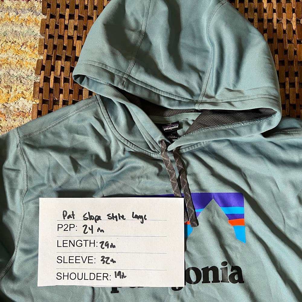 The Patagonia Slope Style Pullover Hoodie in green and grey is a versatile and stylish choice for men in size Large. This hoodie features long sleeves, a drawstring closure, and a hood, making it perfect for outdoor activities like hiking in the winter, fall, or spring. The regular fit and machine washable care instructions add convenience and comfort to this high-quality garment from the reputable brand Patagonia.