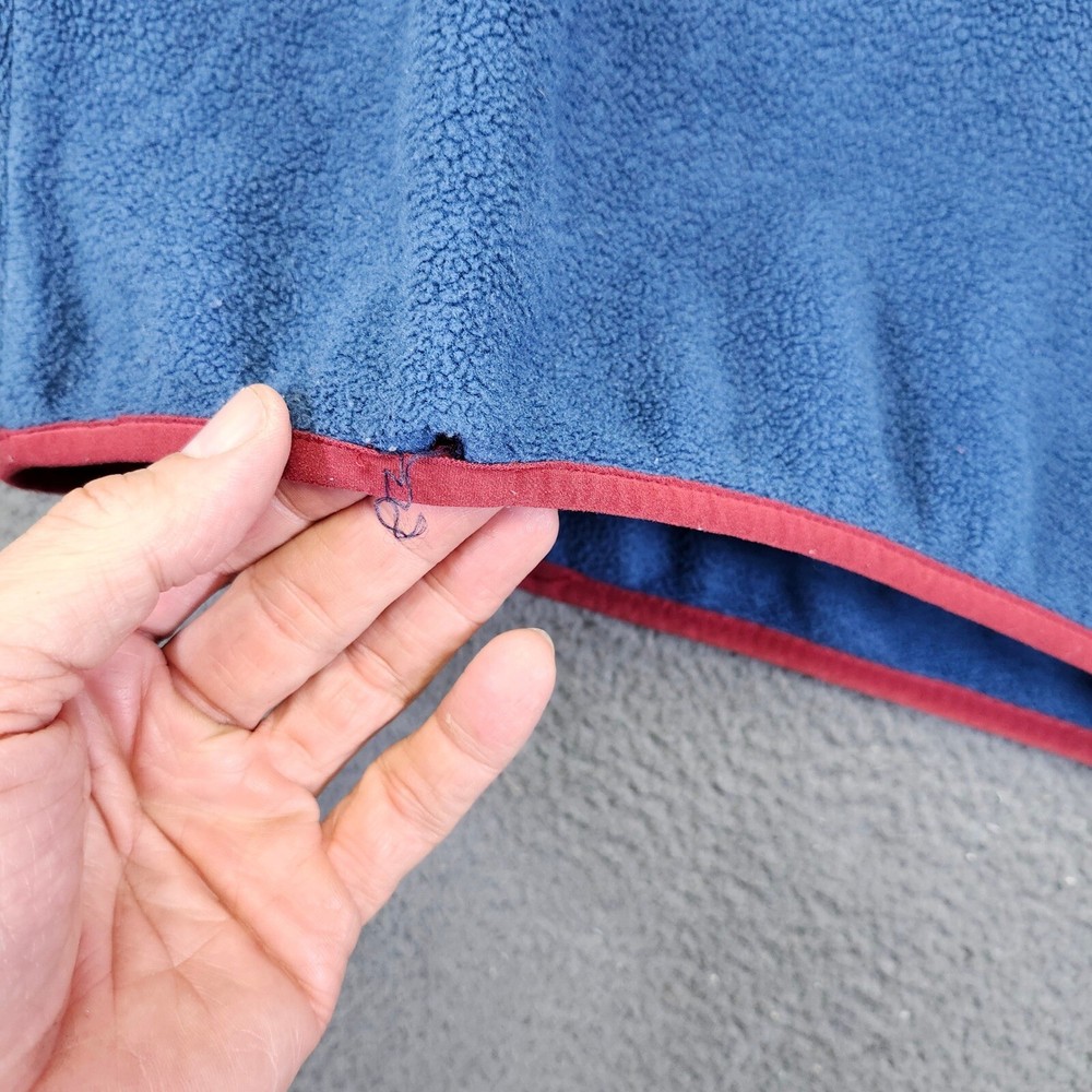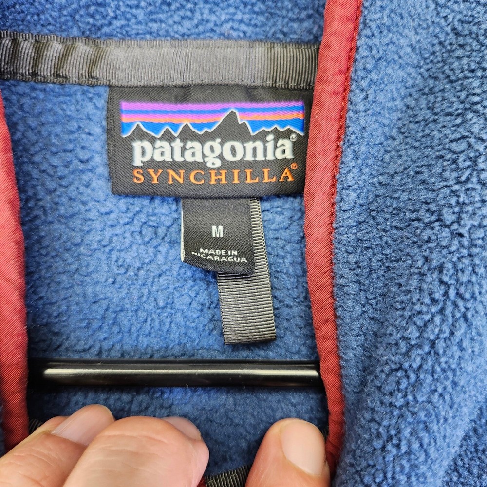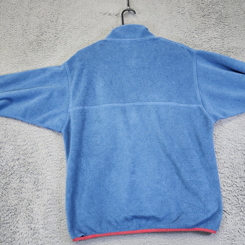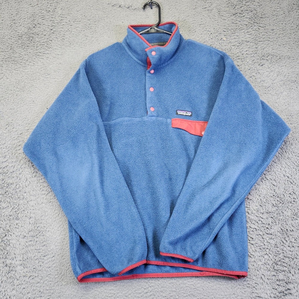 A cozy and stylish Patagonia Synchilla fleece pullover, perfect for outdoor adventures or casual wear. This mid-layer features a classic design with a snap button placket and a stand-up collar for added warmth. The fleece material provides excellent insulation and comfort, while the coral trim adds a pop of color and visual interest. It also includes a snap-closure chest pocket for secure storage of small essentials. Type: Sweatshirt Color: Blue Department: Men Style: Pullover Features: Chest Pocket, Snap Button, Mid-Layer, Stand-Up Collar, Insulated Closure: Snap Fabric Type: Fleece Character: Retro, Outdoor, Casual, Hiking, Cozy Performance/Activity: Hiking, Walking, Outdoor, Casual, Skiing Accents: Button, Logo Pattern: Solid Keywords: Patagonia, Synchilla, Fleece Pullover, Coral Trim, Blue, Outdoor, Top, Mid-layer, Snap Button, Chest Pocket, Cozy, Warm, Hiking, Casual * All items have been cleaned and disinfected * We stand behind all items we sell so please contact us if you have an issue with any order * Look at pictures for any imperfections " Holes, Stains Etc.."