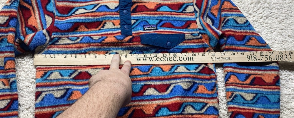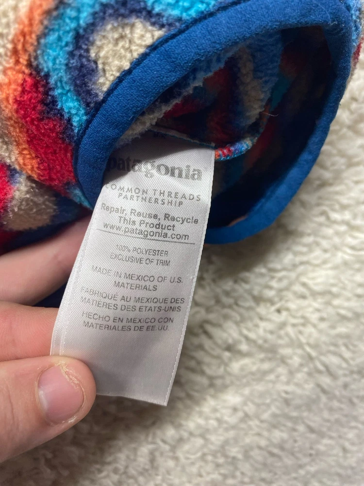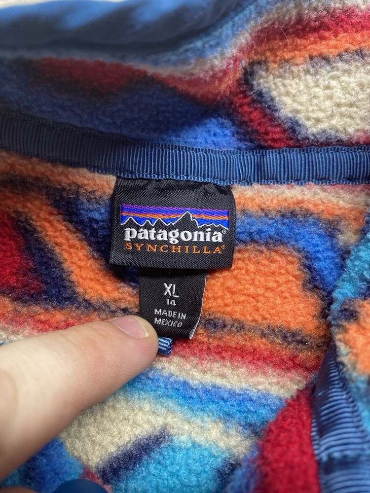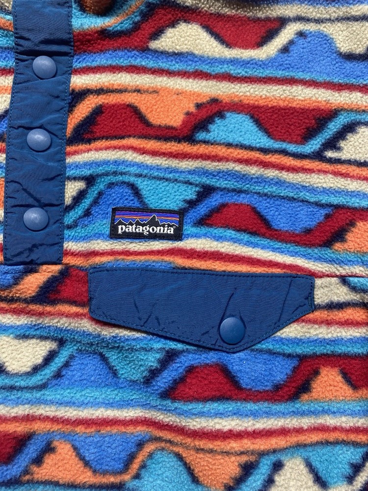 The Patagonia Synchilla Snap-T Fleece Pullover Jacket in Youth XL is a stylish and versatile outerwear option for kids. Made from 100% polyester, this jacket features a snap closure and a colorful Aztec-inspired design. Perfect for outdoor activities or casual wear, this basic jacket with a multicolor theme offers both comfort and style for young adventurers.