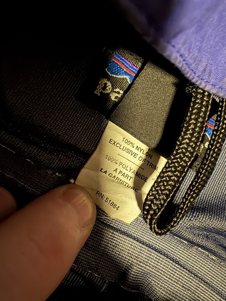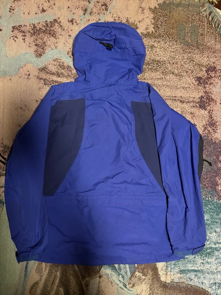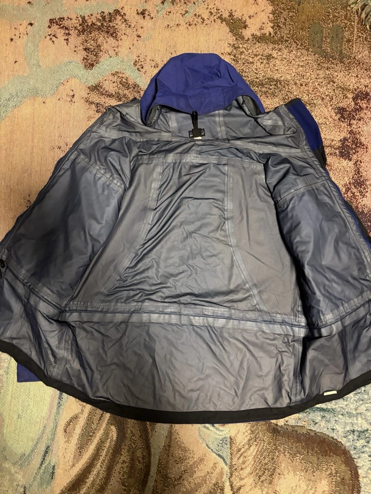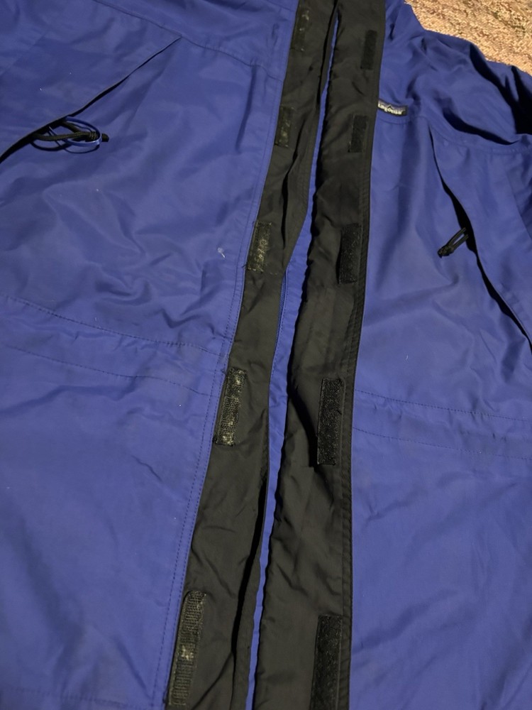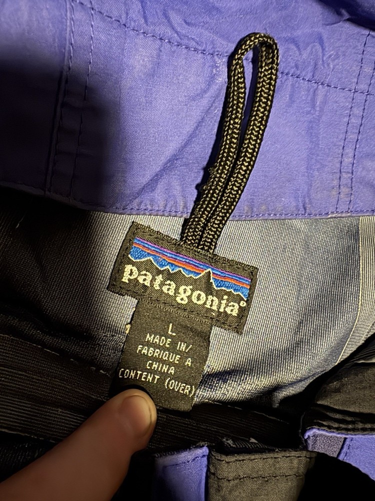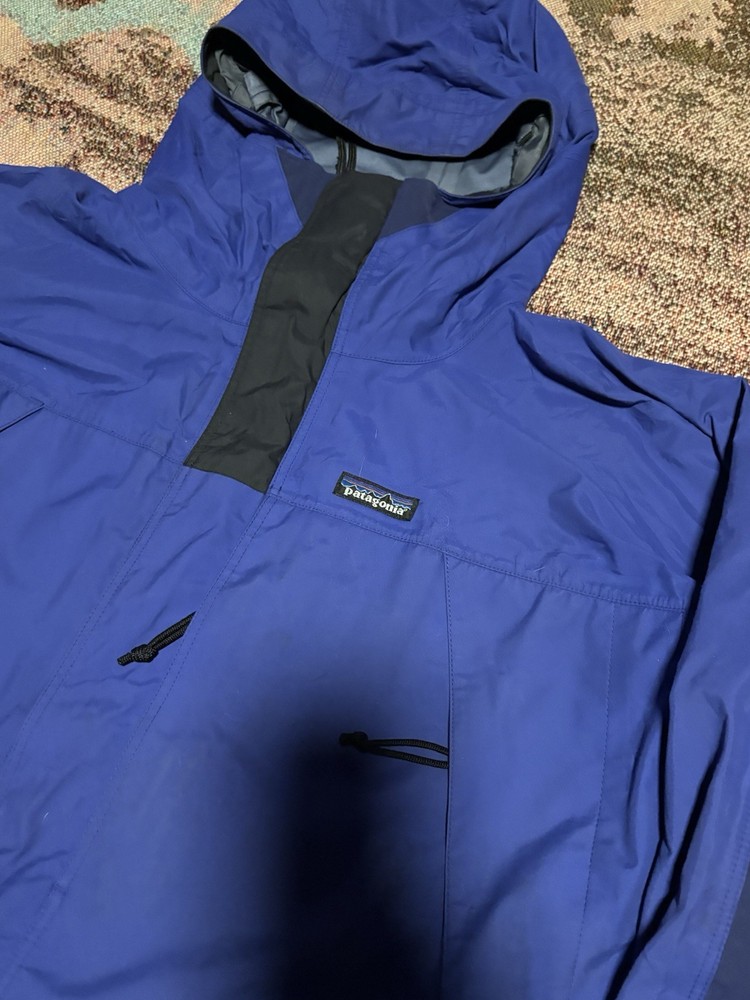 The Patagonia Triolet Jacket is a men's large blue hooded jacket with a full zip closure, making it waterproof and perfect for outdoor activities such as hiking. This jacket is designed for travel and casual occasions, featuring a softshell fabric type and polyester lining and insulation. The Patagonia logo accents the solid blue color, while the polyester outer shell material ensures durability and comfort in winter, fall, and spring seasons. Machine washable and with a regular fit, this stylish overcoat by Patagonia is ideal for outdoor enthusiasts seeking a reliable and functional jacket for their adventures.