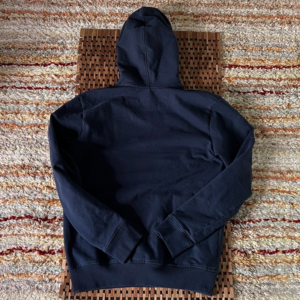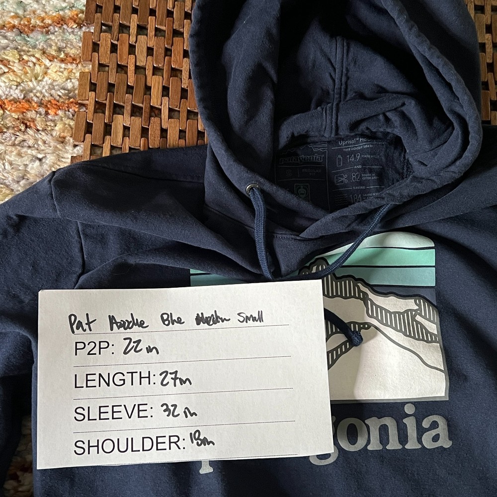 The product is a Patagonia Uprisal Hoodie, a men's small pullover sweatshirt in a solid blue color. Made of cotton, this hoodie features a crew neck, long sleeves, and a hood for added warmth. It is designed for outdoor activities like hiking, making it perfect for winter, fall, and spring seasons. This hoodie is machine washable and has the brand's logo on the front, giving it a stylish look ideal for activewear.