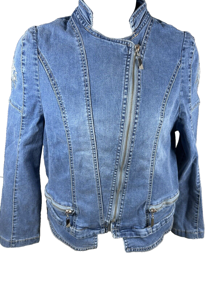 "Jeans" Denim Motorcycle Jacket Sequin Sun w/Face Appliqué L READ