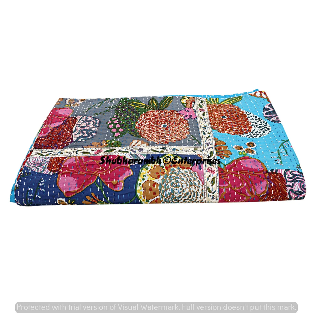 Patchwork Floral Kantha Quilt Queen Size Throw Bedding Boho Stitched Coverlet