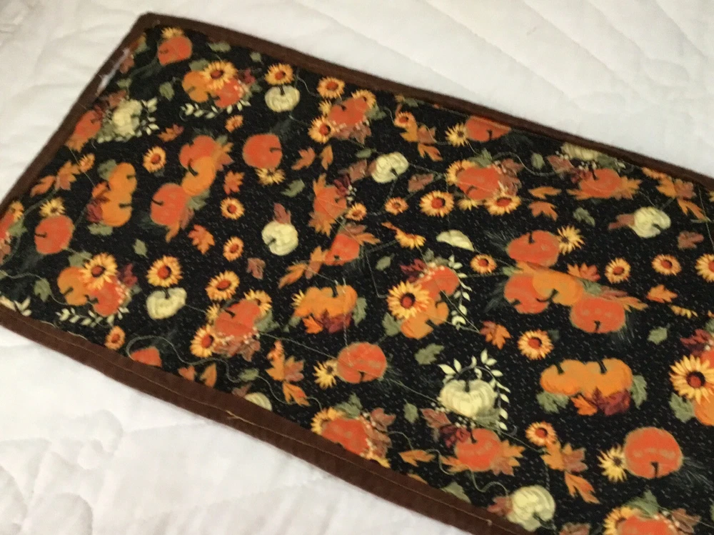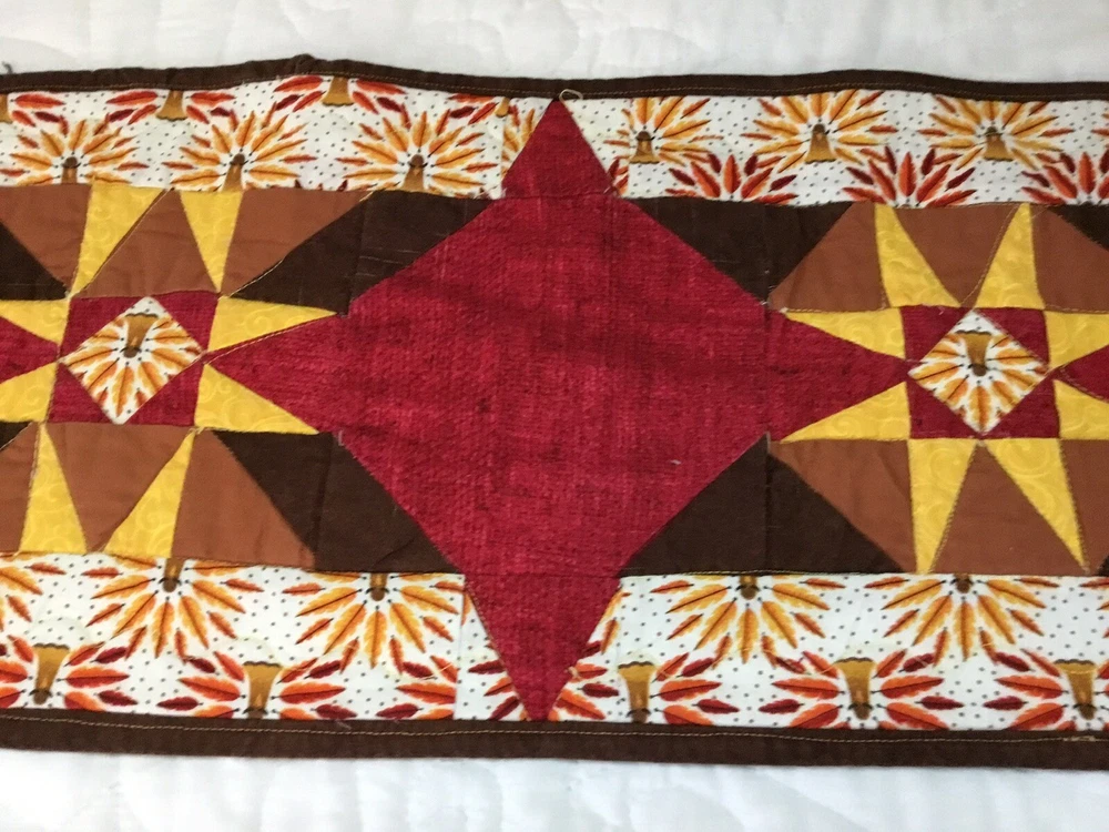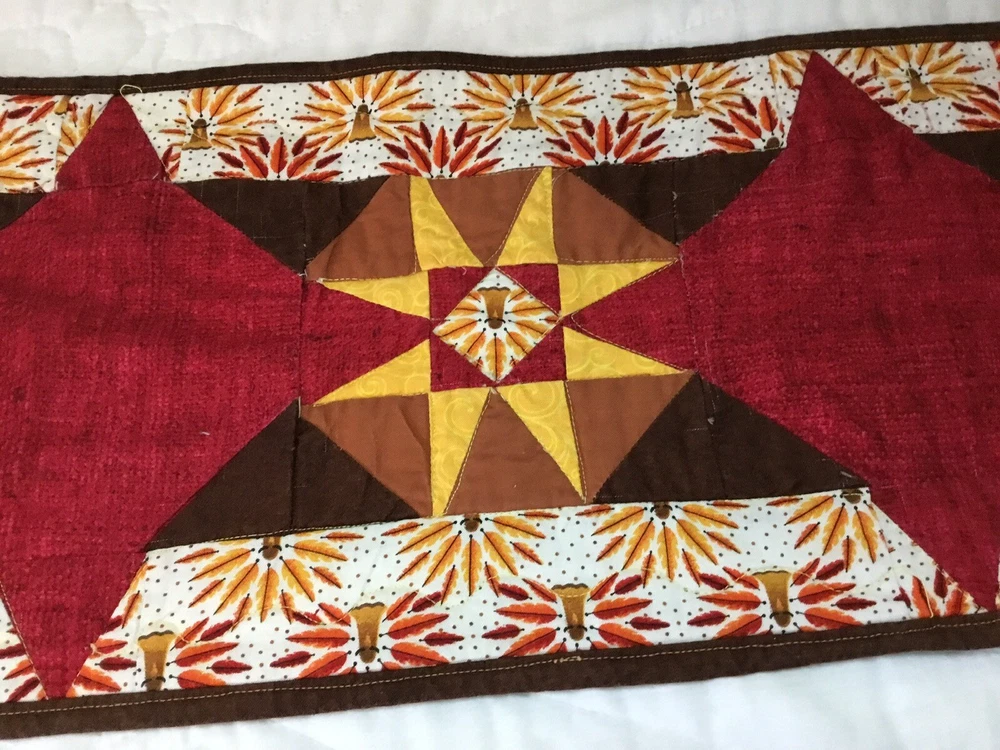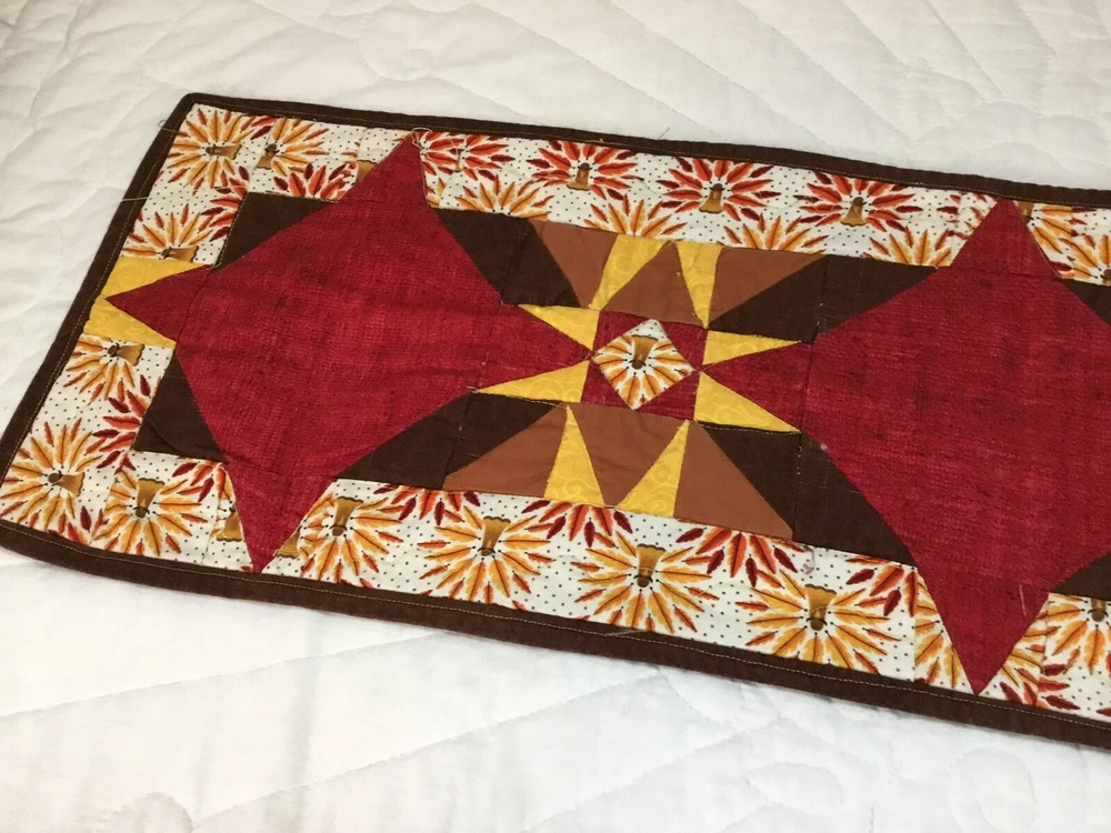 Up for sale is a patchwork quilt table runner. The design is star. The fabrics are solids, print, leaf prints. The colors are brown, off white, gold, yellow, red, cranberry. The border is brown solid, machine sewn. The back is pumpkin, leaf print. Machine quilted. Medium thickness. Very, very good condition. Measures 10 1/4” by 45”. Hand made. Made in the USA. Thanks and happy bidding. I will combine shipping charges. Smoke free home. Please make payment in three days ~~~~Please visit my ebay store: 🇺🇸webbsamericancountry1🇺🇸 for over 2000 vintage and collectible items.~~~~🌺🌼🌹