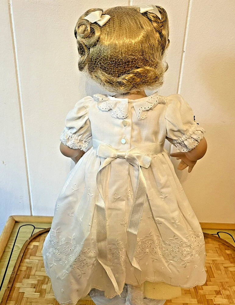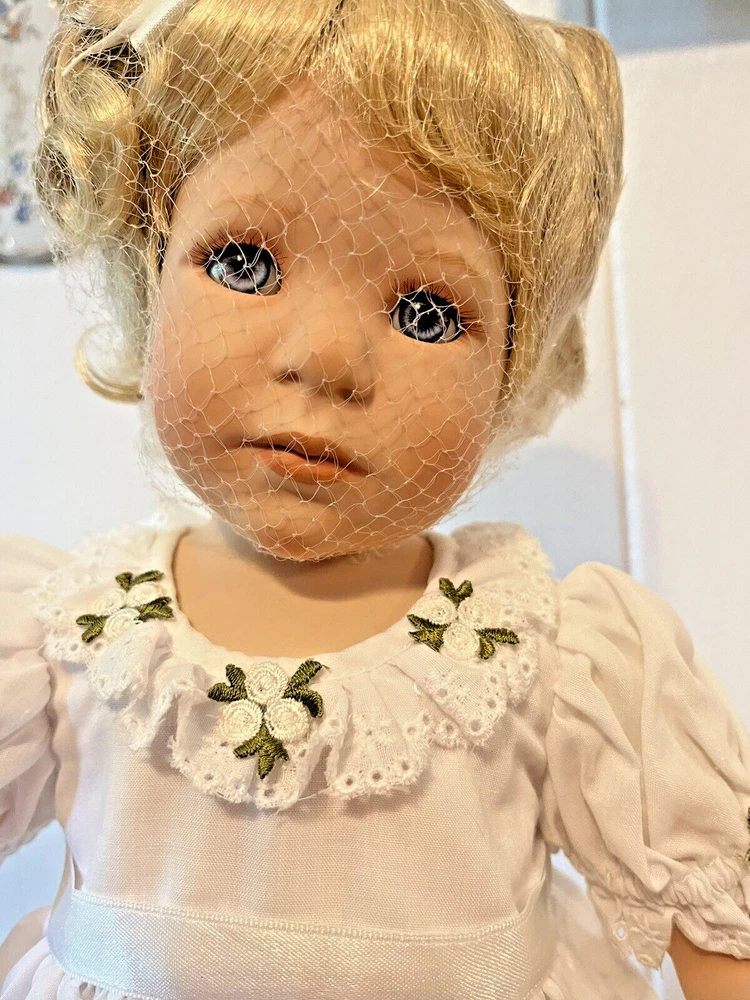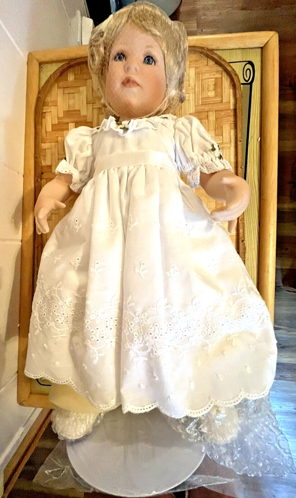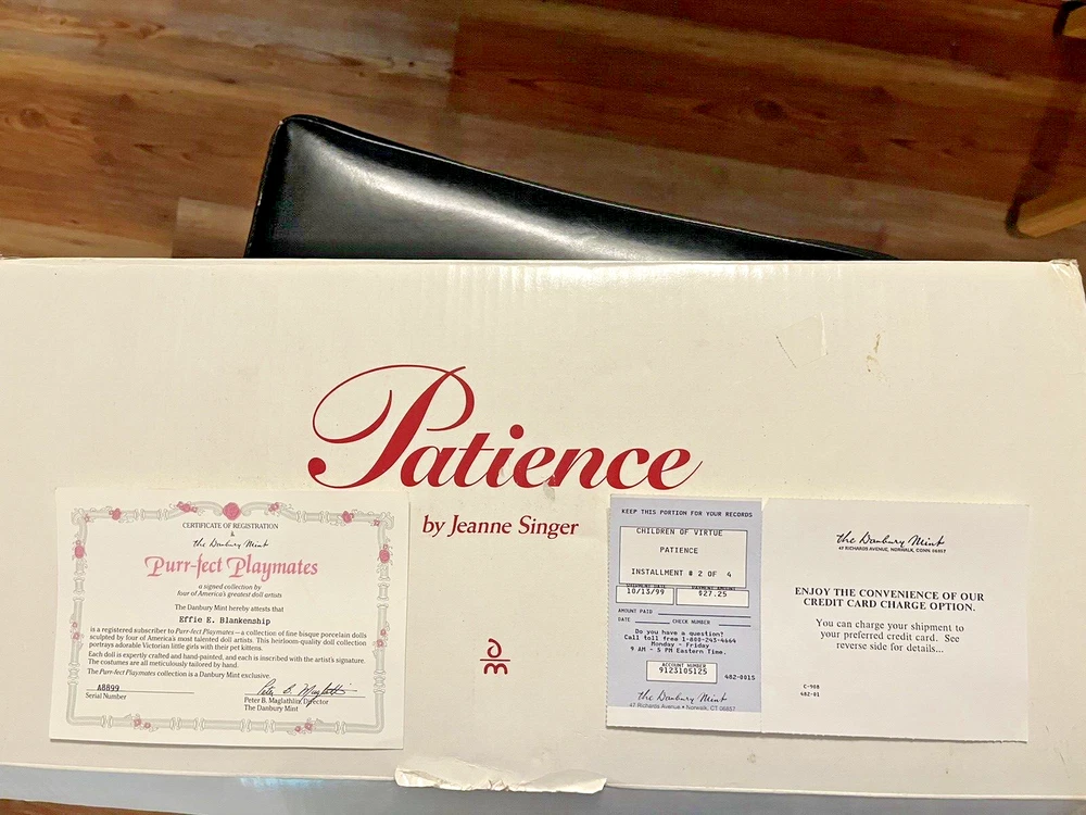 BRAND NEW IN BOX WITH STAND!π Danbury Mint "PATIENCE" adorable toddler in a pure white dress and shoes to enhance her baby girl innocence by designer Jeanne Singer with COA Her blonde hair and head are in a hairnet, and she has bubble wrap & foam roll on her limbs. Her hair will fluff out to 2 cute pigtails. Beautiful blue glass eyes and her expression make her look like a real child. SHIPPED IN HER ORIGINAL BOX INSIDE ANOTHER BOX WITH FOAM FOR ADDED SECURITY FROM BREAKAGE!! 6 lbs. total from NON-SMOKING home Thanks for LπKING!