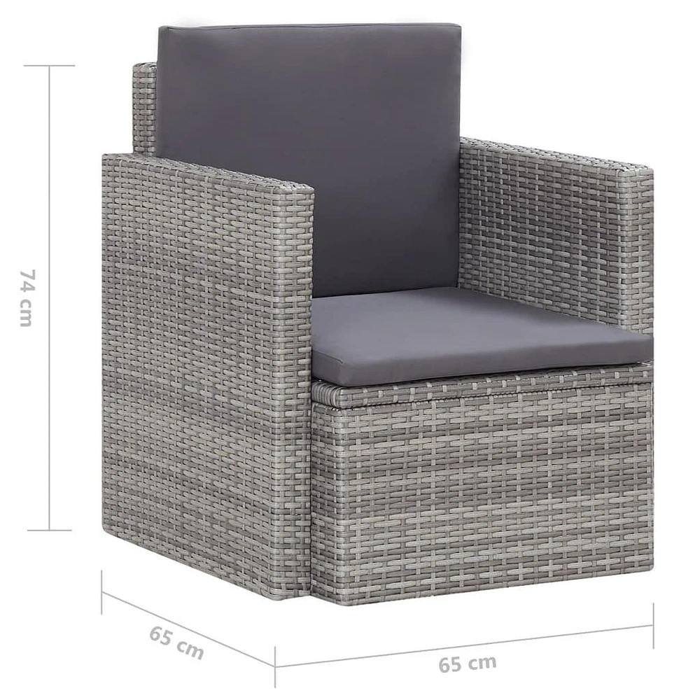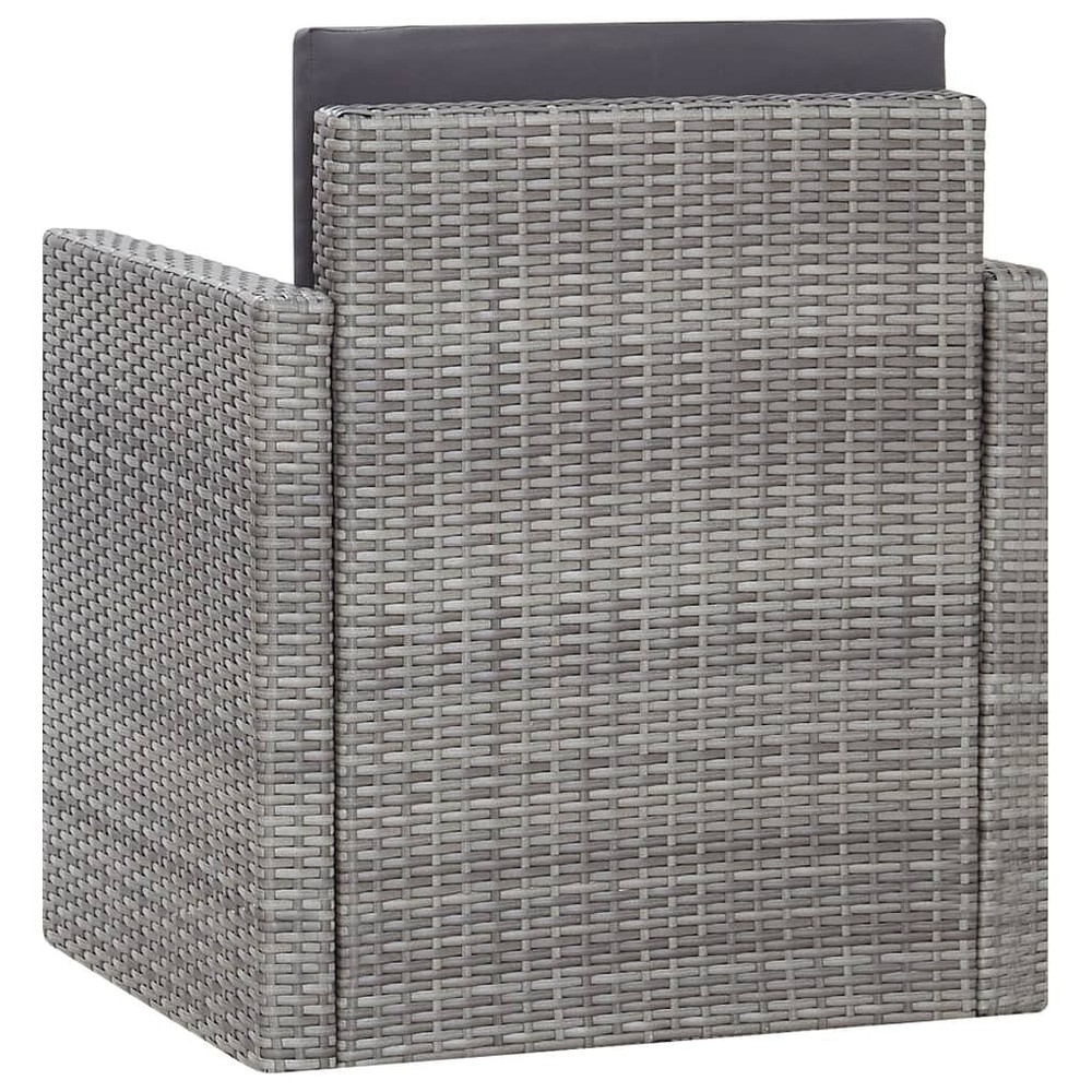Size: Single This patio chair mixes modern style with comfort, making it a fab pick for your outdoor furniture lineup. The smooth lines and sleek look go really well with the soft cushions, giving you a warm spot to relax in your garden or on your balcony. Weather-Resistant Material: Made from quality poly rattan, this chair holds up against the weather, ensuring it lasts outdoors. Comfort: With two soft cushions, this armchair gives you brilliant support for laid-back outdoor lounging, so you can kick back for ages. Modern Design: The sleek grey shade makes it a stylish choice for patios, balconies, or gardens. Lightweight Structure: Even though it's strong, the chair's light, making it a breeze to move when you want to change things up. Easy Maintenance: With removable cushion covers, cleaning is super easy, making it a snap to keep it looking tidy. Color: Grey Shape: Square Material: Synthetic Poly Rattan Finish: Powder-Coated Indoor/Outdoor: Indoor / Outdoor Cover Included: No Room: Garden and terrace Capacity: Warning: California Proposition 65 Maximum Number of People: 1 Dimensions: 10.1 in x 10.1 in x 11.5 in (W x L x H) Weight: 22.93 lbs Seat Depth: 9.3 in Seating Capacity: 1 Swings: No Delivery Contains: 1 x Garden chair, 2 x Cushion Assembly Required: Yes Recommended Number of People for Assembly: 1