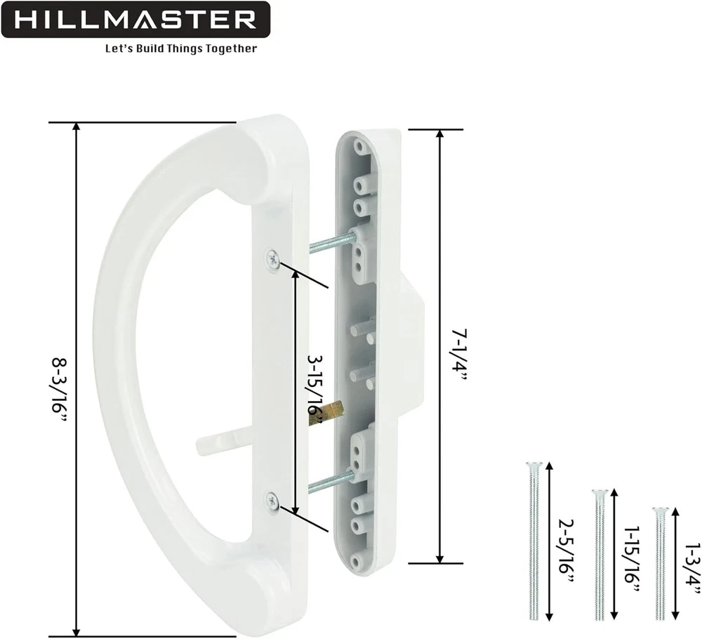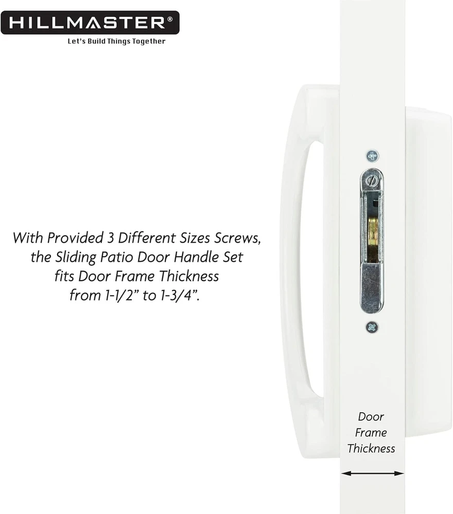 Patio Sliding Glass Door Handle Replacement Set Patio Handles Fits 3-15/16” Description 【Economical Replacement Door Handles】Don't spend too much money to replace the whole door! HILLMASTER durable universal sliding patio door handle set can complete your patio sliding door perfectly, die-cast metal white finish design fit great with any color patio glass door. 【NON-KEYED & NON-HANDED】The exterior pull comes non-keyed, sliding glass door handle suitable for mortise-style doors and features an offset thumb-turn lever, design for right or left handed. Note: This handle is not convertible with key function now. 【Package Includes】Interior Handle, Exterior Pull, Thumb Latch Lever, 6x Screws with 3 different sizes: Large 2-5/16", Medium1-15/16”, Small 1-3/4”. Note: please choose the right length screws according door thickness. 【Quick Installation】Glass Sliding Door handles set fits 1-1/4” to 1-3/4" thick door and 3-15/16" hole spacing, Standard reversible, only works with mortise hook style door handles, Note: Please refer to the dimensional details carefully before purchasing. 【Professional Guarantee】We are specialized in producing various hardware fittings more than 15 years, please go find all kinds of home hardware fittings you need in HILLMASTER store! Please feel free to contact us if there is any problem. We are committed to providing the professional products and the caring service for every consumers. Product Description Replacement Door Hadle Set When your door handle is broken, old or unsightly, don’t replace the door entirely, just get a new sliding patio door handle set. Multi-purpose Handle Hardware Perfect for screen door, storm door, sliding door, glass door, patio door and so on. Cost effective to replace old door handles. Easy and Quick Installation Just need a screwdriver and another helping hand to hold the latch in place, basic screwdriver is the only thing you really need. SHIPPING We are always working hard to ensure your package arrives as soon as possible. Please understand that some factors like weather, high postal traffic, and the performance of shipping companies are outside of our control. We offer free shipping to the lower 48 states and ship within 2 business days of payment, usually sooner. We do not accept P.O. Boxes. Please provide a physical address. For shipping outside of the continental USA, we only use eBay's Global Shipping Program.The item is shipped to KY and then sent to the rest of the world. International customers are responsible for all duties and taxes. Continue to check out in order to calculate costs for shipping the item to your country. Messages regarding eBay's Global Shipping Program MUST be directed at eBay EXCLUSIVELY. RETURNS We offer a 30-Day Return Policy on items which you are not completely satisfied with. You have the option for a full-refund or an exchange of the item. No returns are available on items shipped outside of the USA. CUSTOMER SATISFACTION We try our very best to make sure every customer is completely satisfied. If there's a problem, message us! We're happy to help.