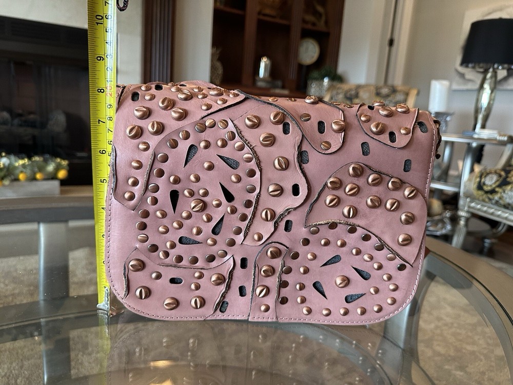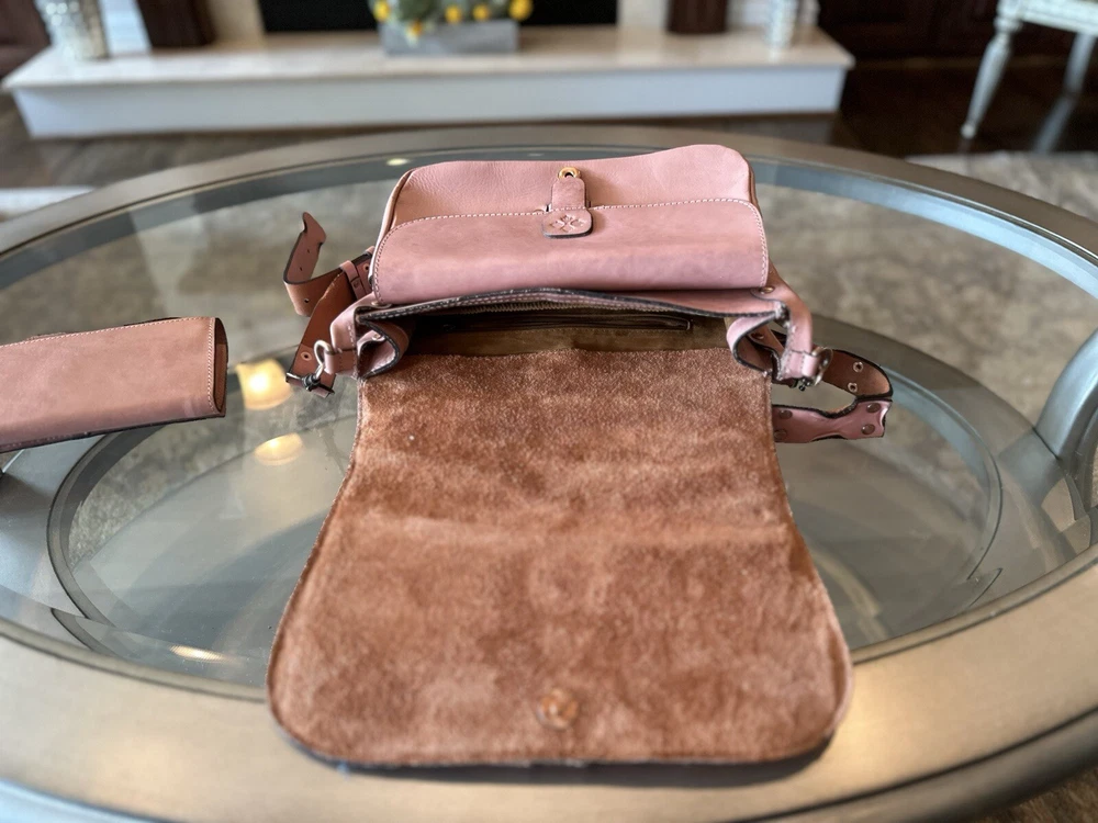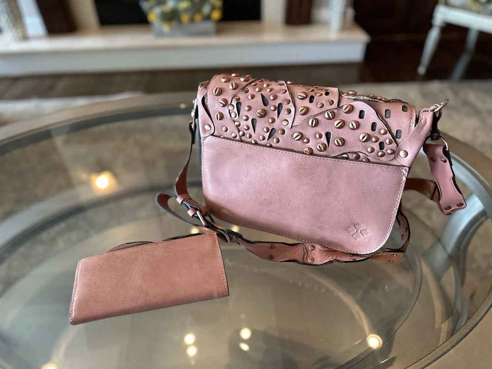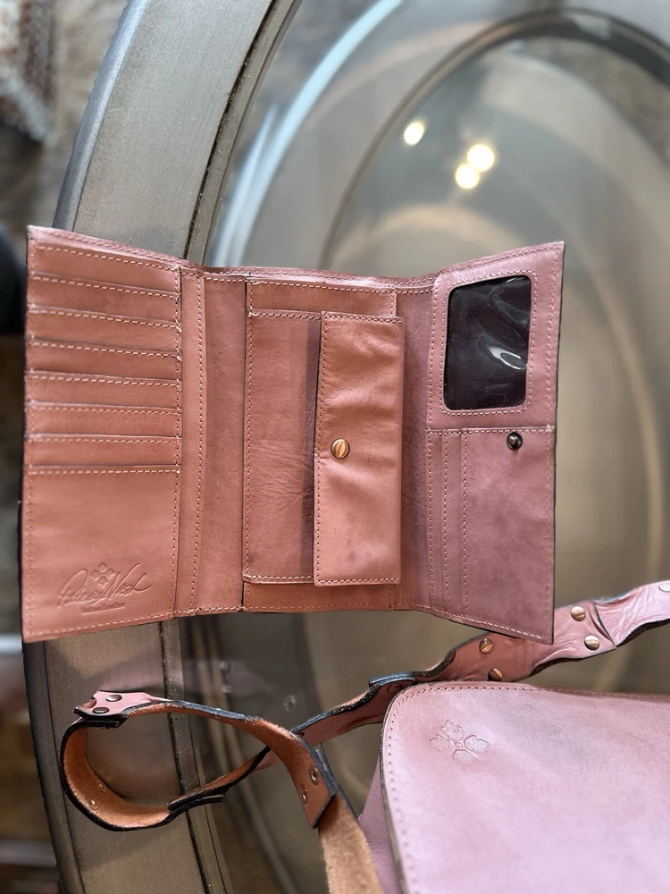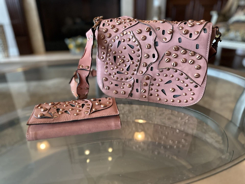 This stunning Patricia Nash Granada handbag and matching wallet are the perfect accessory for any fashion-forward woman. The bag features a beautiful pink and bronze exterior made of genuine leather with brass hardware, and a detachable strap for versatile wear. The wallet is similarly designed with a matching pattern and is perfect for storing all of your essentials. The bag has a flap closure and measures 11 inches in width, 9 inches in length, and 8 inches in height, making it a medium-sized accessory. The wallet has multiple compartments and pockets for your phone, keys, and other small items. This limited edition set is perfect for anyone who loves unique and colorful designs.