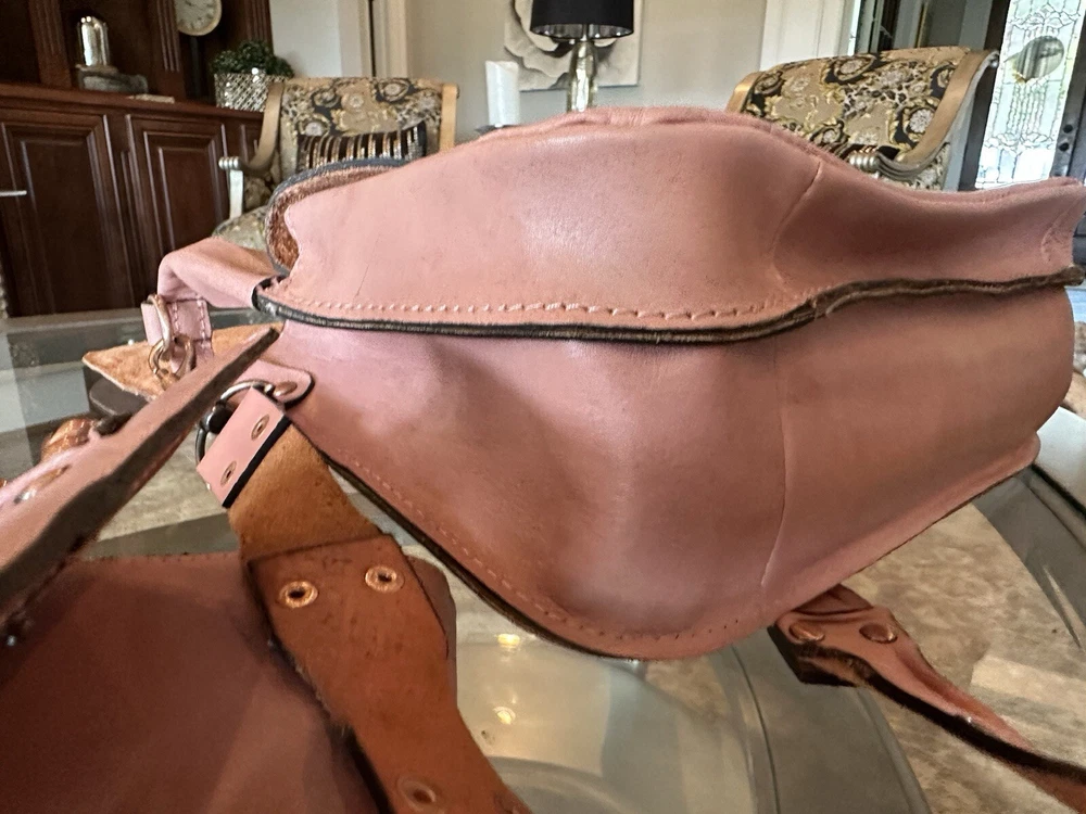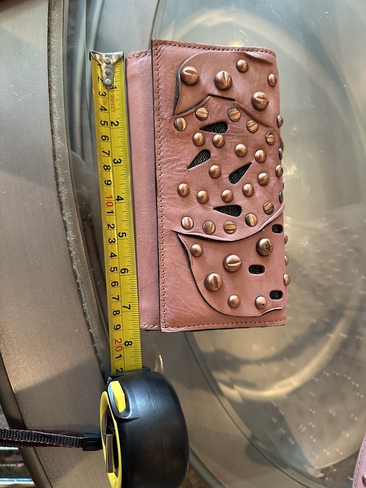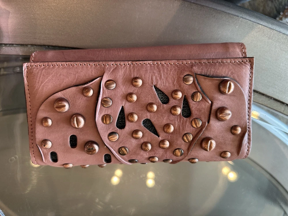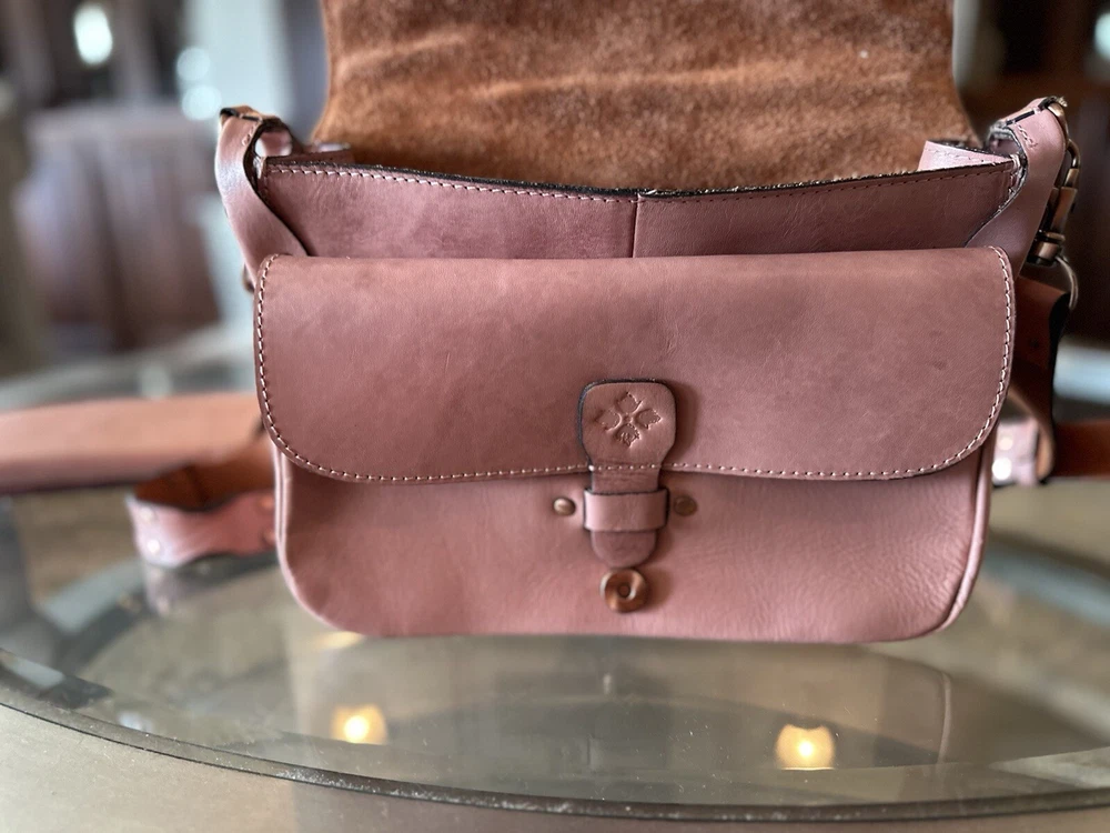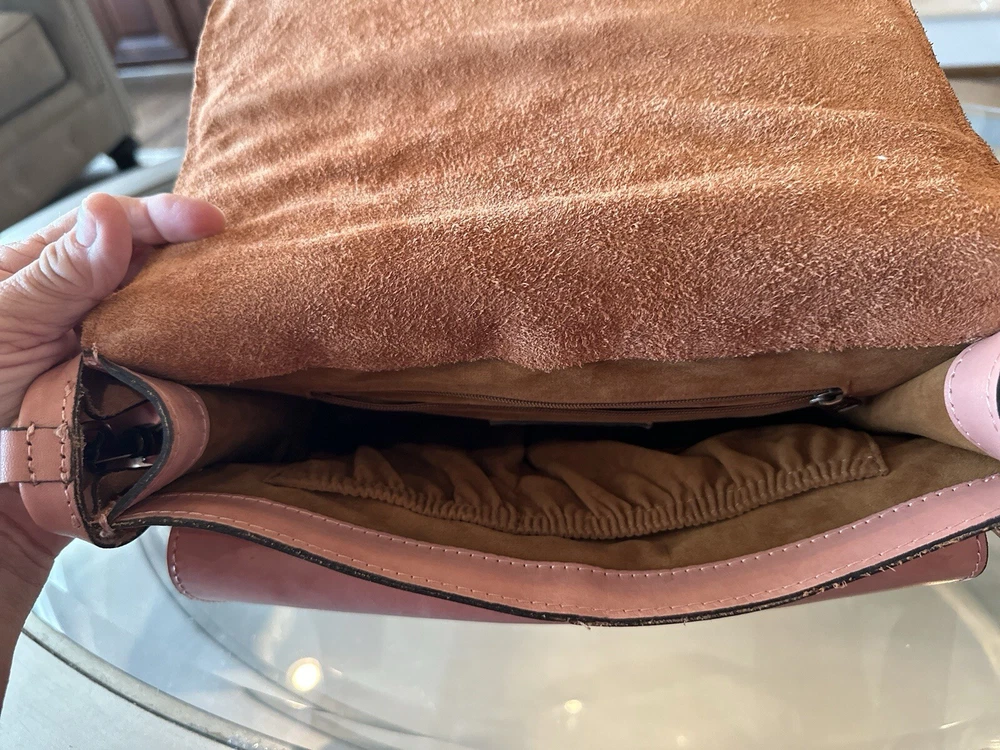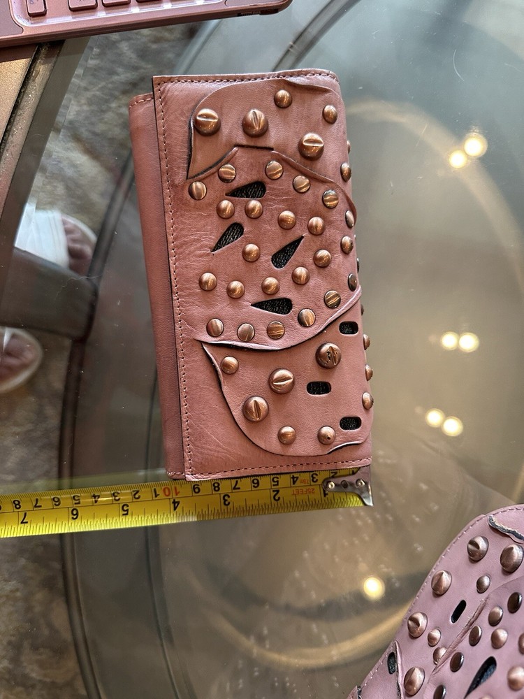 This stunning Patricia Nash Granada handbag and matching wallet are the perfect accessory for any fashion-forward woman. The bag features a beautiful pink and bronze exterior made of genuine leather with brass hardware, and a detachable strap for versatile wear. The wallet is similarly designed with a matching pattern and is perfect for storing all of your essentials. The bag has a flap closure and measures 11 inches in width, 9 inches in length, and 8 inches in height, making it a medium-sized accessory. The wallet has multiple compartments and pockets for your phone, keys, and other small items. This limited edition set is perfect for anyone who loves unique and colorful designs.