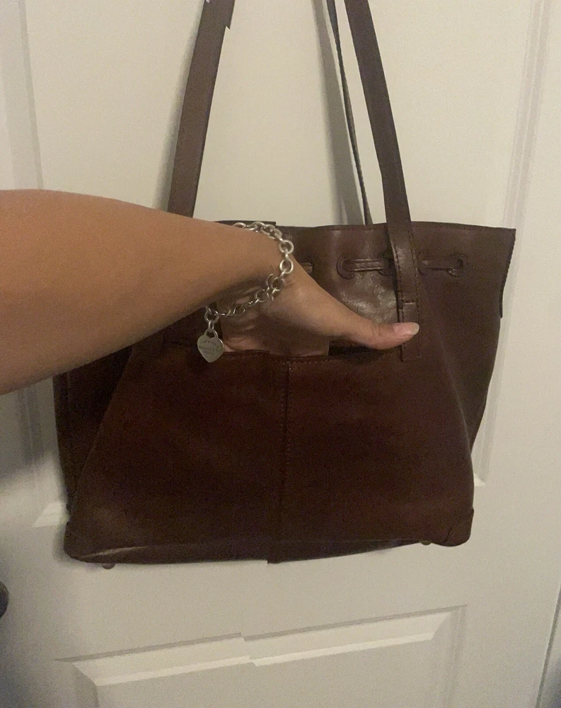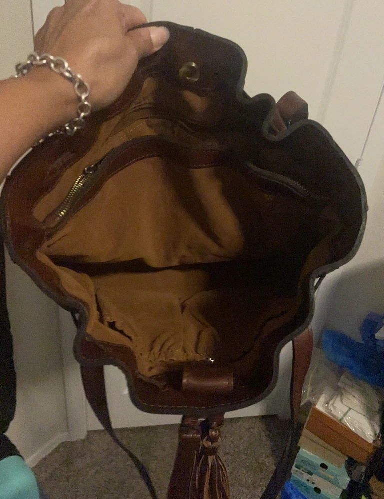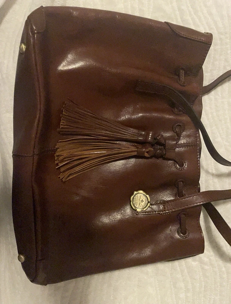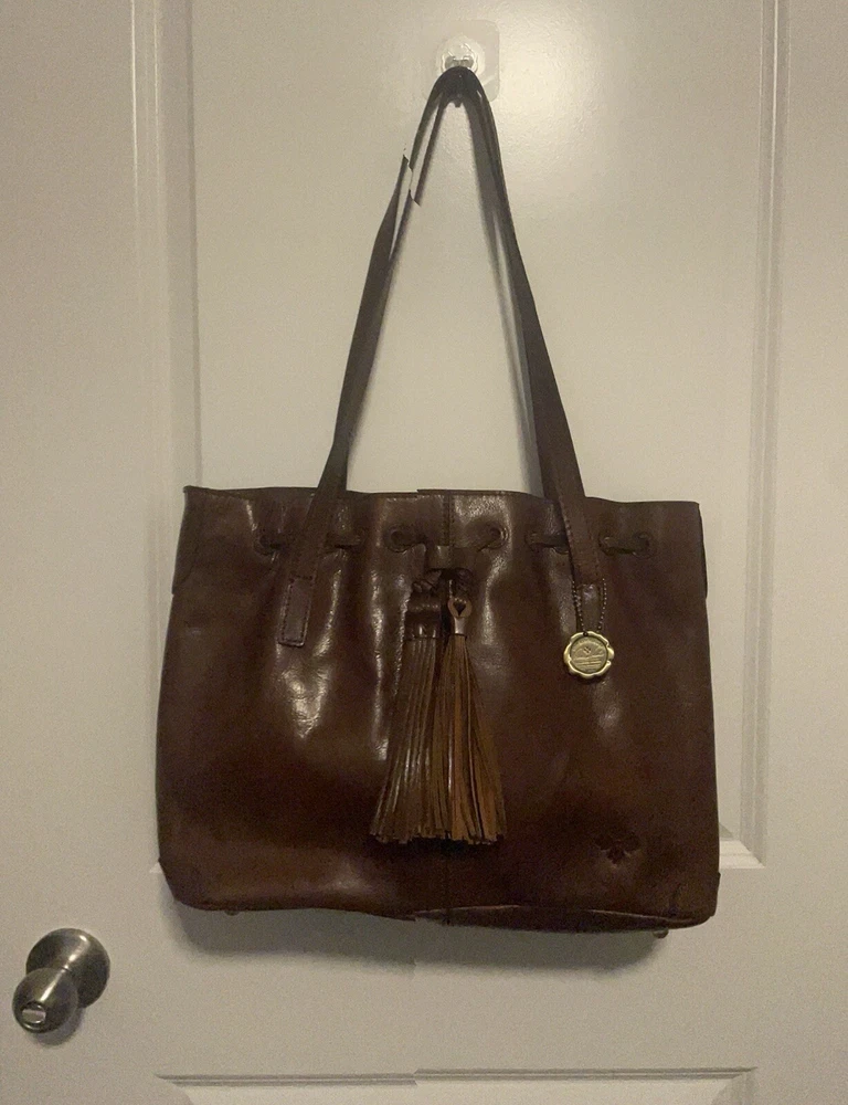 This beautiful Patricia Nash tote bag is perfect for any occasion. The drawstring closure and double handles make it easy to carry, while the tassel accents and gold hardware add a touch of elegance. The bag is made of high-quality brown leather and lined with soft suede, providing ample protection for your belongings. With a spacious interior measuring 16 inches in width, 11 inches in height, and 5 inches in depth, this large tote bag is ideal for travel, parties, workwear, and more. The bag also comes with a charming bag charm accessory and a durable leather handle/strap material. Get your hands on this classic and timeless piece from Patricia Nash's 10th anniversary collection today.
