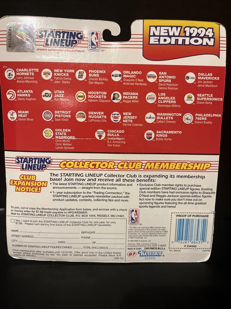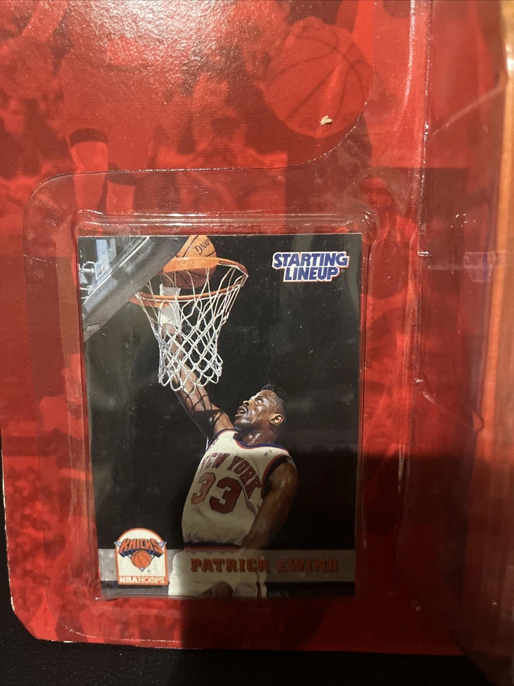 This Patrick Ewing Starting Lineup action figure is a must-have for any New York Knicks fan. The figure stands at 4.75 inches and features Ewing in his Knicks uniform. It is part of the Starting Lineup series and was manufactured by Kenner in 1994. The figure is officially licensed by the NBA and is a great addition to any sports memorabilia collection. The color of the figure is blue and it represents the sport of basketball-NBA. The item is in excellent condition and is ready to be displayed.