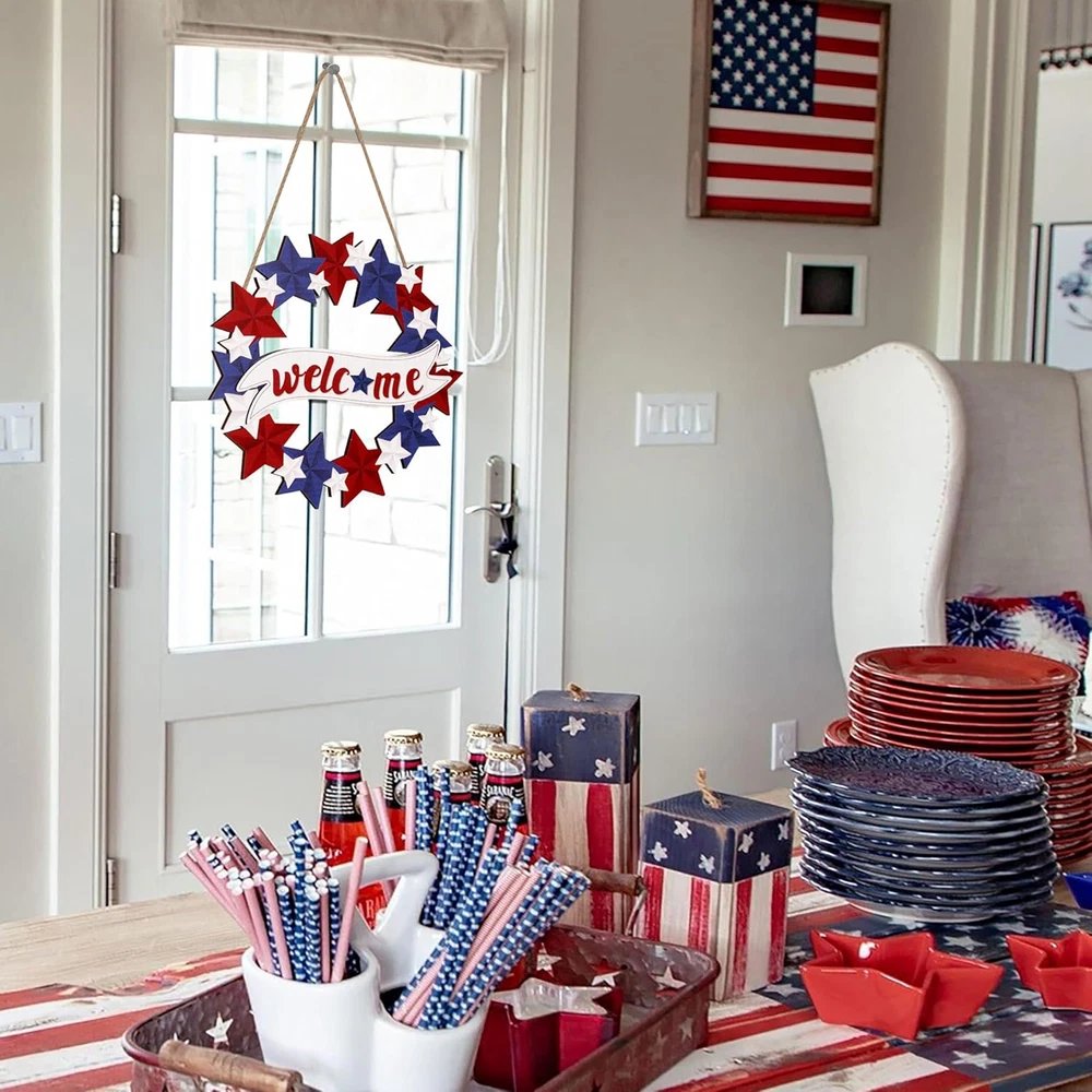 Package Included: 1pcs 4th of july wooden sign Feature: The welcome wreath sign, designed with surrounded red white blue stars, boasts vibrant, beauty printing Foldable: The wooden wreath is made of wooden board. Opening size measures 13.6*13.6 inches. It is convenient to hang up and store Where to Use: Adorning your front door, glass door, window, wall, and more, this wreath sign adds a patriotic touch to any space. Infuse your surroundings with the spirited essence of the 4th of July and impress neighbors and guests, inviting them into a festive atmosphere 4th of July Decorations: Turn your home into a patriotic haven with these 4th of July decorations. Whether it's a party, a patriotic celebration, or a family gathering, let this decor set the tone for a joyous Independence Day celebration Product Description Red White and Blue 4th of July Wreath Design Welcome, with bow Design Star Design Mason Jar Color Red white and blue Color Red white and blue Color Red white and blue Occasion 4th of July Occasion 4th of July Occasion 4th of July