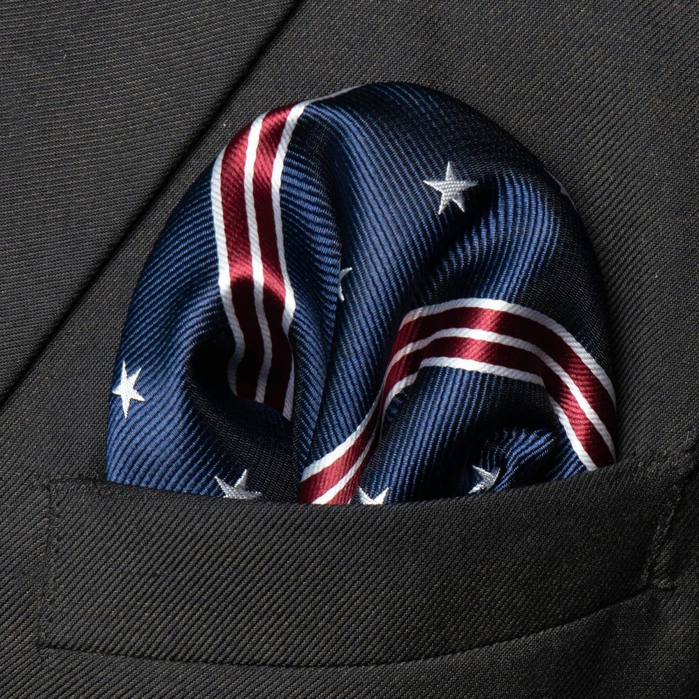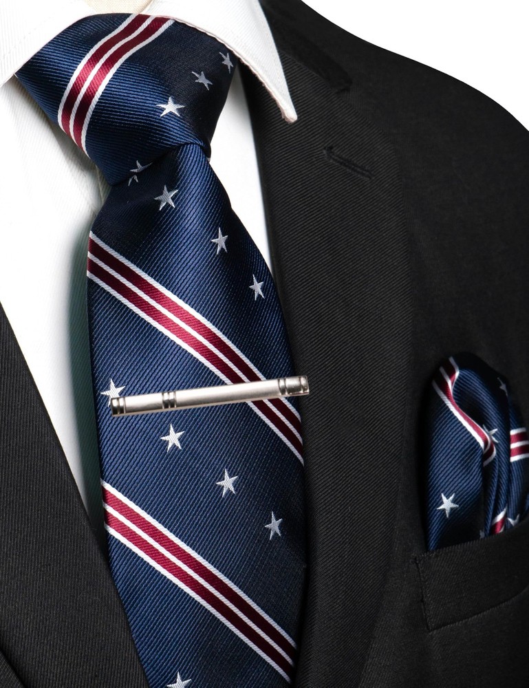 Patriotic Navy Blue American Flag Tie Set with Pocket Square and Clip