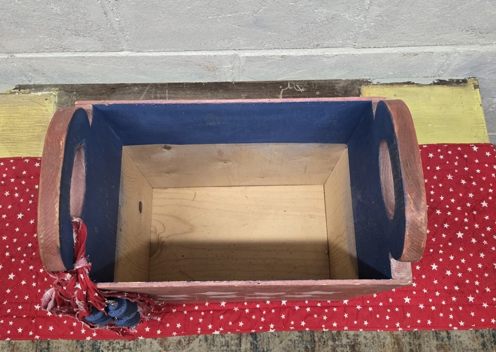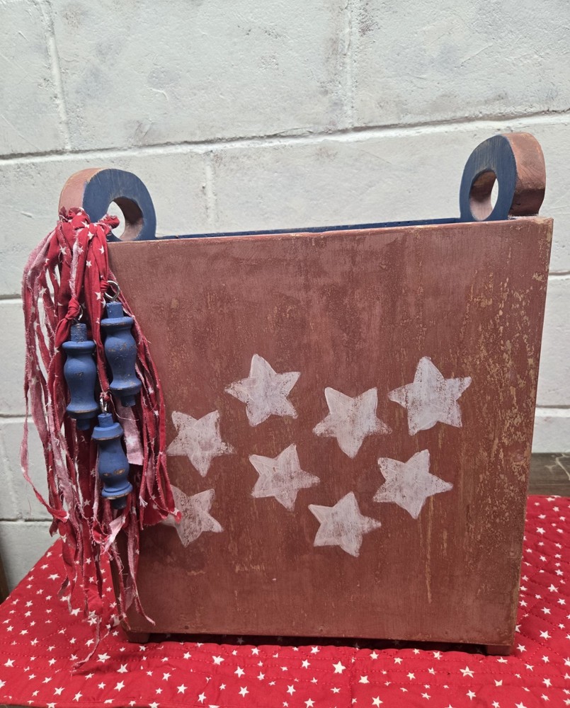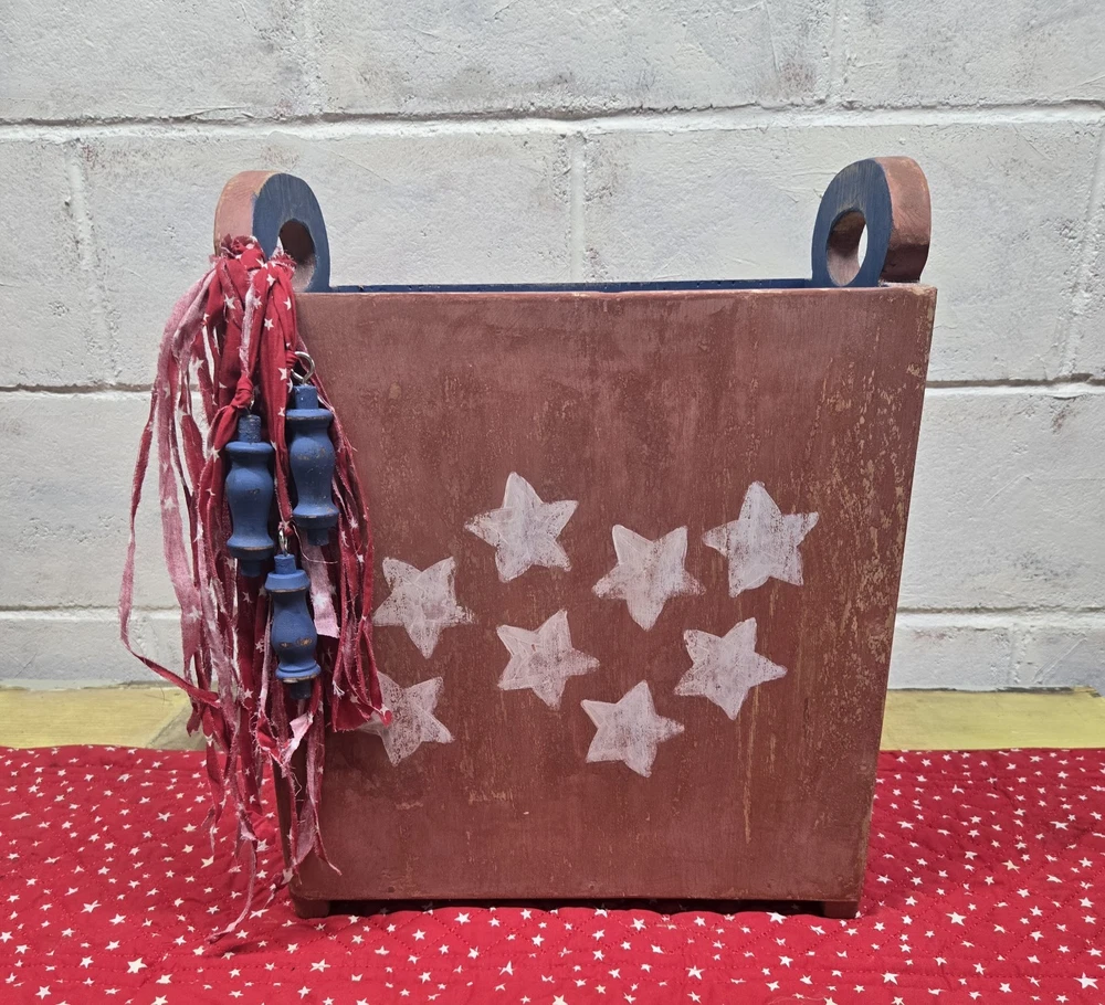The Wood Americana 4th of July Storage Tote with Wood tassels is a rustic and primitive-style tote made of wood. Perfect for storage or displaying small items, this tote features decorative wood tassels and is ideal for adding a touch of Americana to your home decor. Made with quality materials, this unique and stylish piece is sure to be a conversation starter in any room. Painted with milk paint and sealed. 16 tall. 13 length, 7 wide