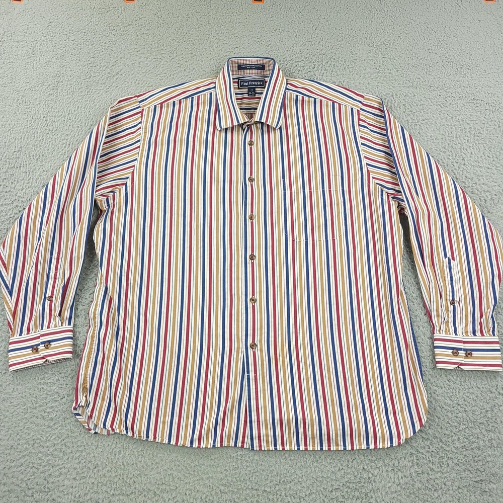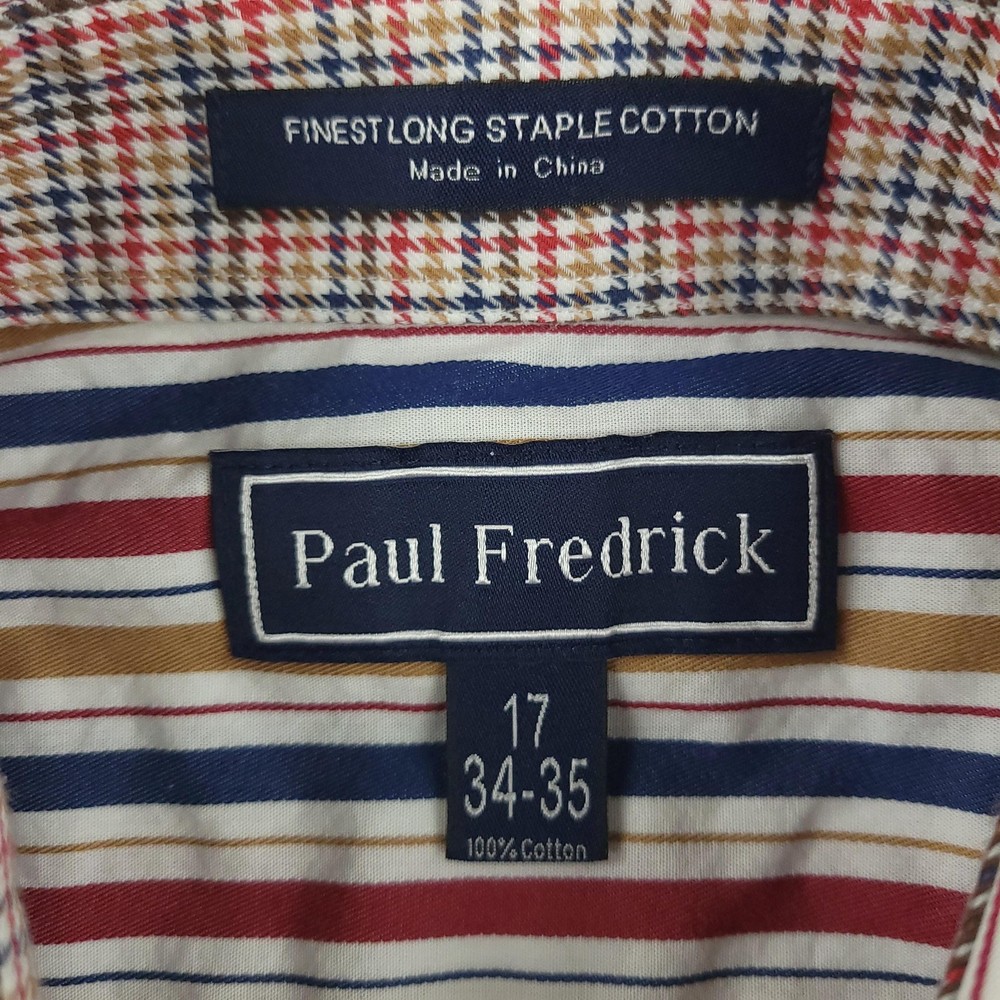 Paul Fredrick Dress Shirt Mens 17 34-35 Multicolor Stripe Cotton Long Sleeve Condition: Gently worn Brand: Paul Fredrick Tag size: 17 neck / 34-35 sleeve (Mens) Material: 100% Cotton Pattern/Color: Multicolor vertical stripes (red, blue, tan/gold, white) Features: Spread collar, button-front placket, single chest pocket Details: Adjustable two-button barrel cuffs, contrast houndstooth inside cuffs and collar stand Back yoke with pleats for ease; classic shirttail hem Made in China Washed and dried with Fragrance Free Detergent & Dryer Sheets. Measurements are included in the photos, compare measurements with your item to ensure proper fit. (Measurements are done with the item lying flat). I ship next business day and all items include tracking. Items are added daily to my store Visit My Store Buy More & Save! Combined shipping for US customers - $1.99 for each additional item (Add items to shopping cart and discounts will automatically calculate during checkout)
