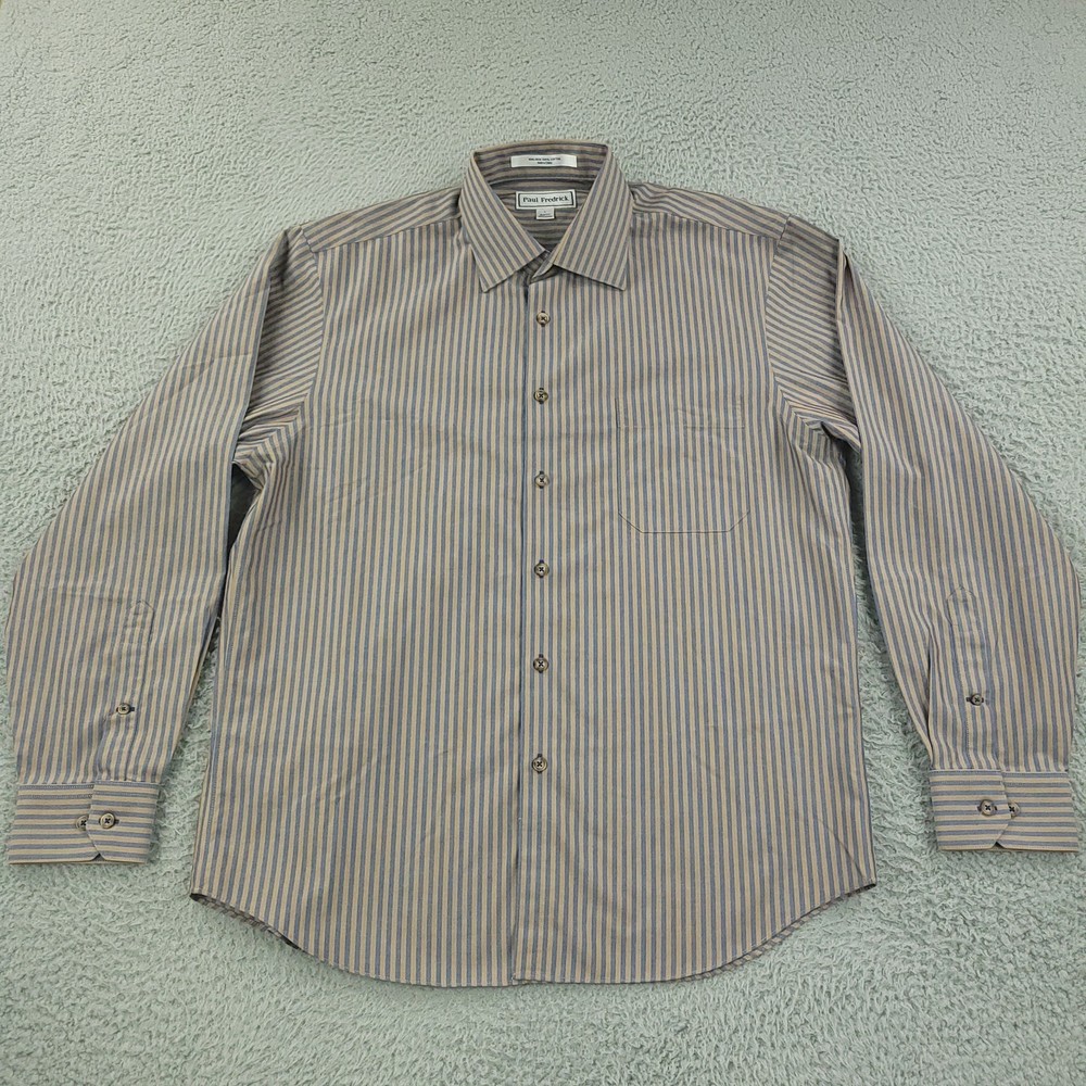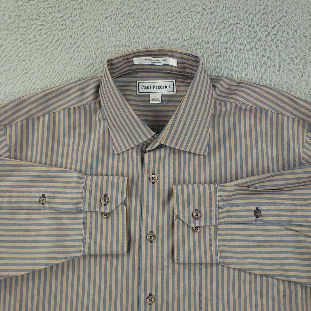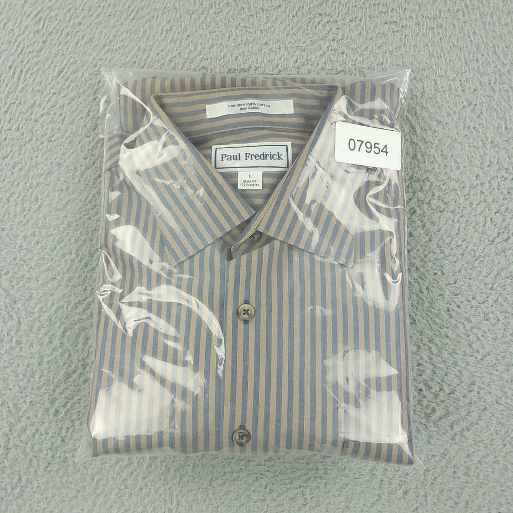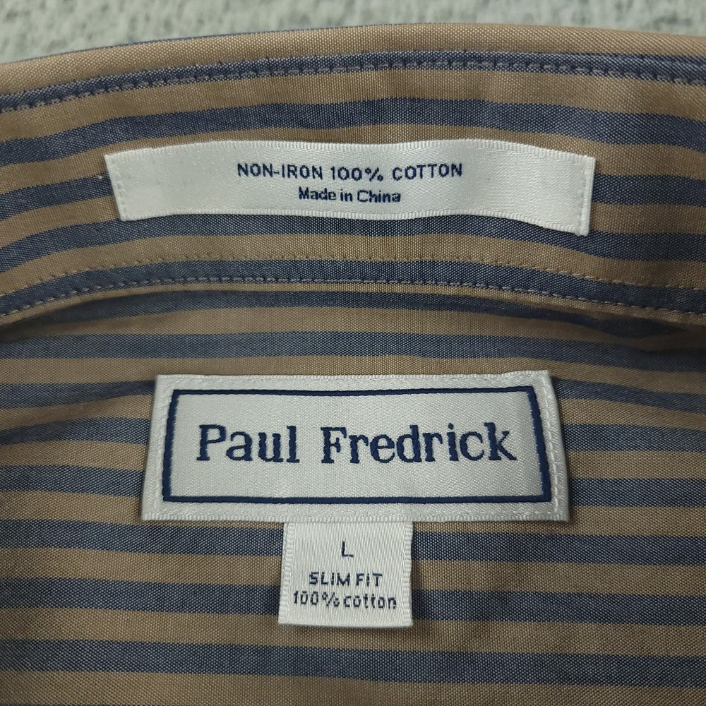 Paul Fredrick Dress Shirt Mens Large Blue Stripe Slim Fit Non Iron Long Sleeve Brand: Paul Fredrick Style: Mens long sleeve dress shirt with full button front, point collar, and slim fit silhouette. Color: Blue and tan vertical stripe pattern. Size on tag: Mens Large (L) Slim Fit. Material: 100% cotton non-iron fabric. Made in China. Features: Non-iron cotton fabric designed to resist wrinkles, long sleeves with adjustable barrel cuffs, single chest pocket, shirttail hem, and a classic collared neckline suitable for business, office, or dress occasions. Measurements are included in the photos, compare measurements with your item to ensure proper fit. Items are added daily click here to Visit My Store Combined shipping for US customers is 1.99 for each additional item Items are cleaned per eBay standards & policies