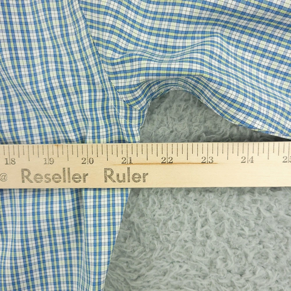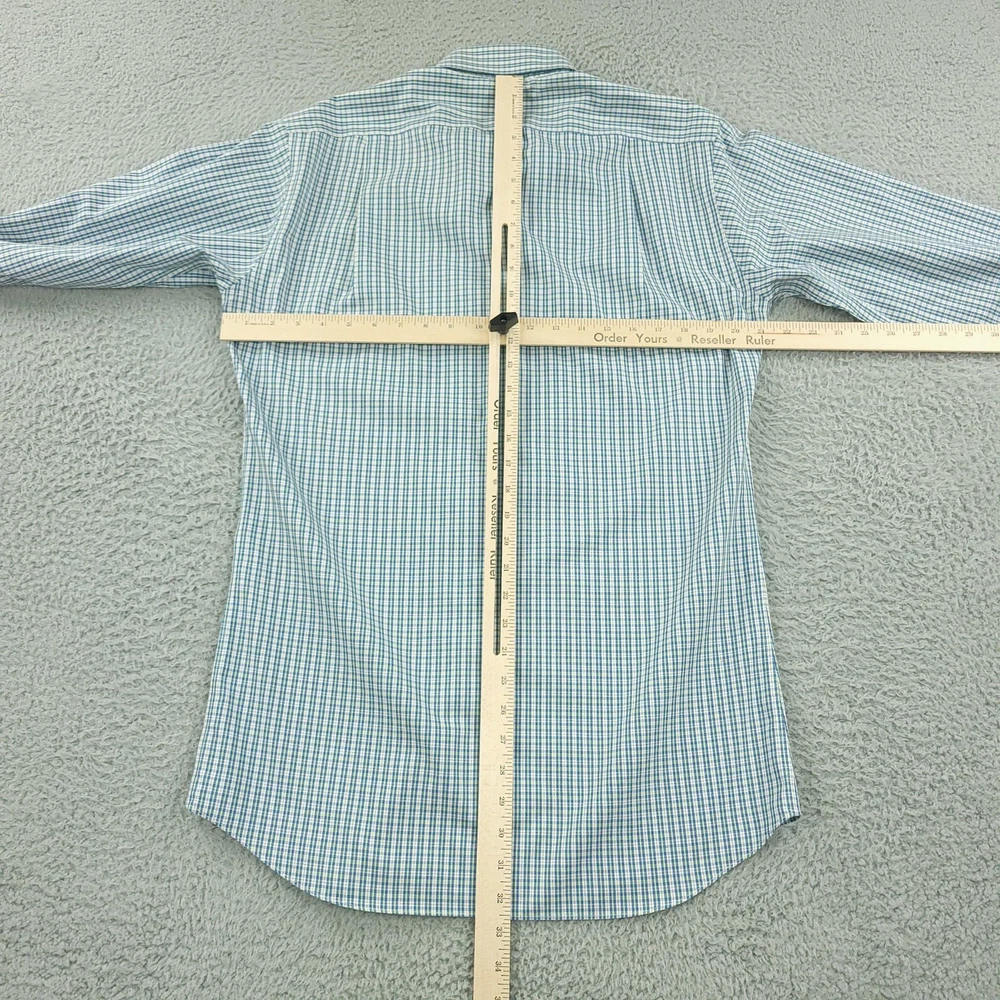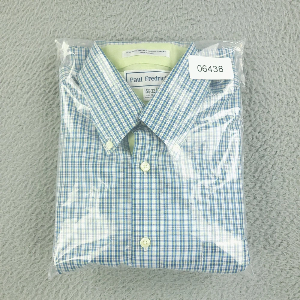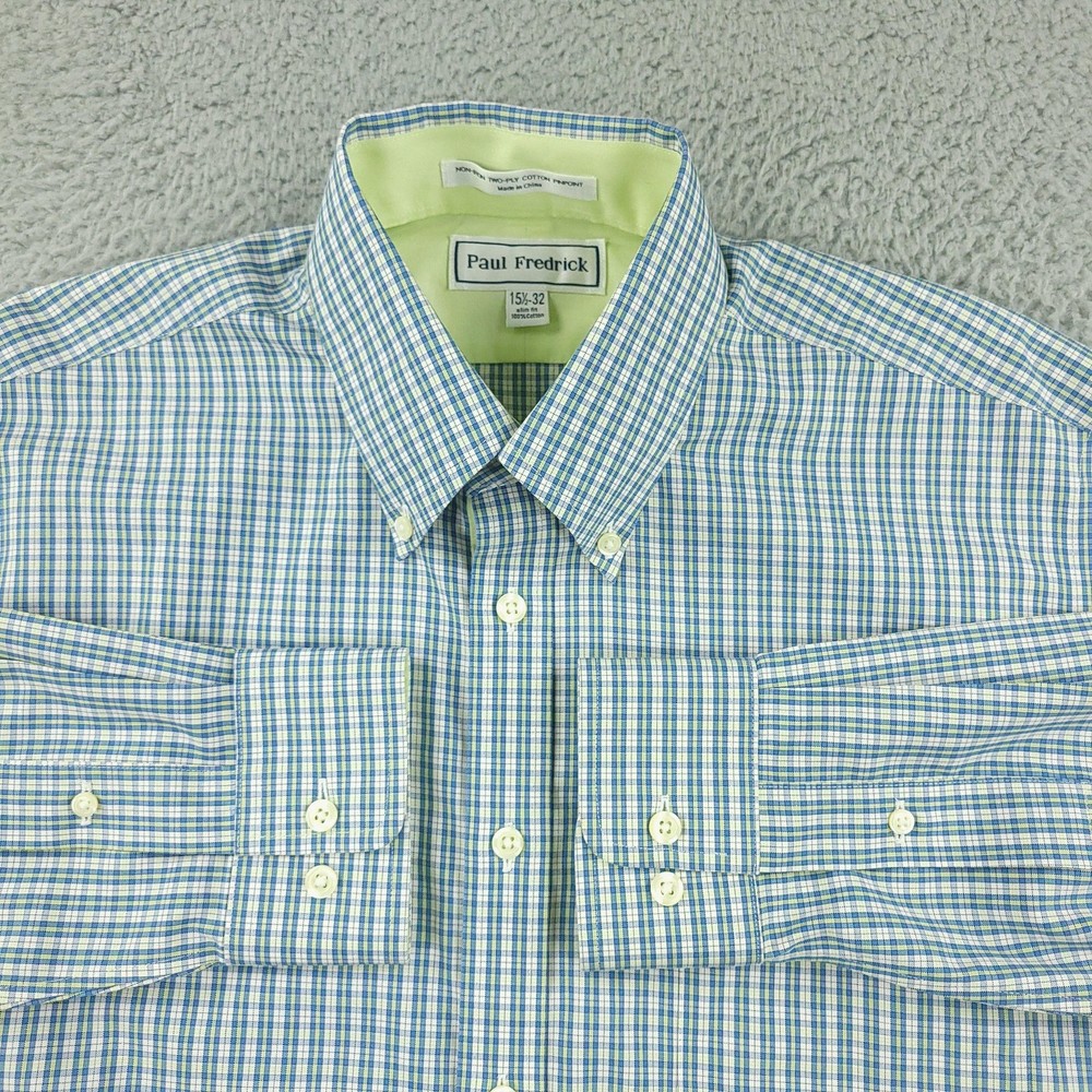 Brand: Paul Fredrick Style: Mens long sleeve button-down dress shirt with button-down collar and single chest pocket. Color: Blue and green small check pattern with light green contrast inner collar and cuffs. Size on tag: 15.5-32 (slim fit). Material: 100% cotton; non-iron two-ply cotton pinpoint; made in China. Details: Front button closure, barrel cuffs, curved hem, lightweight woven fabric, tailored slim fit design suitable for office or business casual wear. Washed and dried with Fragrance Free Detergent & Dryer Sheets. Measurements are included in the photos, compare measurements with your item to ensure proper fit. (Measurements are done with the item lying flat). I ship next business day and all items include tracking. Items are added daily to my store Visit My Store Buy More & Save! Combined shipping for US customers - $1.99 for each additional item (Add items to shopping cart and discounts will automatically calculate during checkout)