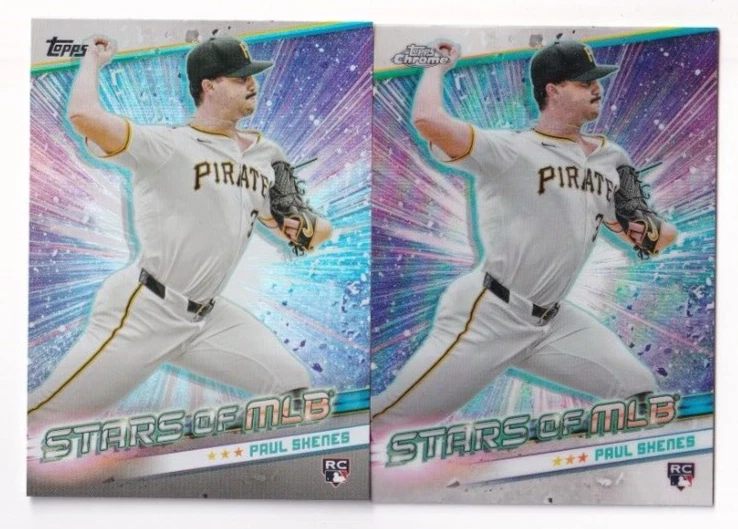 You are bidding on one LOT OF (2) PAUL SKENES 2024 TOPPS UPDATE SERIES RETAIL EXCLUSIVE STARS OF MLB ROOKIE INSERT CARDS: (1) BASE STARS OF MLB #SMLB-64 AND (1) CHROME STARS OF MLB PARALLEL #CSMLB-64. Shipping & Handling in the US is $2.00 MAILED IN AN EBAY STANDARD ENVELOPE WITH TRACKING . Please add .50 cents per extra auction won. Check my other auctions for new released cards from your favorite teams or players. Thank you.