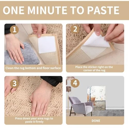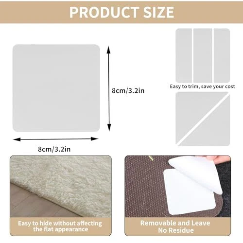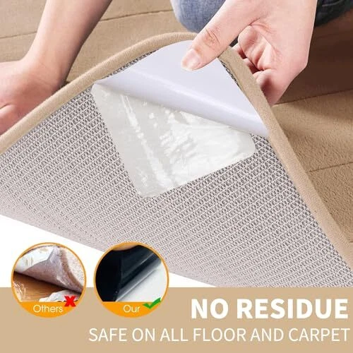 Return Policy Fast Delivery Trusted seller 4 Pcs Rug Gripper for Hardwood Floors, Non Slip Rug Pads for Tiles, Double Sided Anti Slip Rug Grips, Rug Stickers for Wood Floor Product Description Want to know how to keep your rug from moving? We offer you this rug gripper to easily secure your carpet in place and avoid an unplanned “magic carpet ride” and solving the problem of curling rug corners. EASY TO USE: The carpet tape for area rugs is less than 1/10 inch thick, tear it off to fit the carpet securely and tightly, won't leave any marks on the hardwood boards and won't stain or damage the floor. HOW TO USE: Remove the backing adhesive and stick it to the bottom of the carpet, then remove the film covering the surface and firmly press the carpet onto the floor. (THESE HAVE A STICKY ADHESIVE ON BOTH SIDES). QUANTITY: The kit includes 4 pieces. Each piece is square, which increases the contact area with the floor and provides better grip than the triangular shape of other rug stickers. USAGE SCENARIO: This rug corners to hold rug down can be used in the laundry room, master bathroom, kitchen, living room, etc. to prevent pets or children from slipping, providing safety for family members or pets. BRAND SERVICE: If you have any questions about the product, please feel free to contact us. Shipping Returns Payment Shipping Shipping is FREE to all addresses other than APO/PO boxes in the lower 48 states. All our stock ships from US-based warehouses. Shipped via USPS or UPS (depending on location and package weight) Unless stated otherwise, all orders will ship within 24-72 hours of your payment being processed. Check our feedback to see the great reviews of FAST shipping we offer. Returns Seller does not accept returns Payment We currently accept payment via eBay managed payments only. Once payment is cleared, we will dispatch your shipment within 1-3 business days. Please refer to the "Shipping" tab for more information regarding shipping speed to your destination.