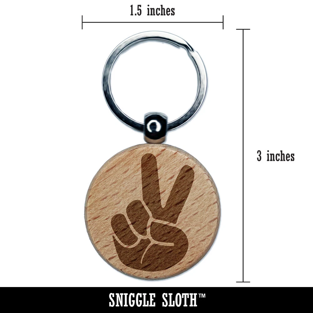 Peace Hand Sign Engraved Wood Round Keychain Tag Charm