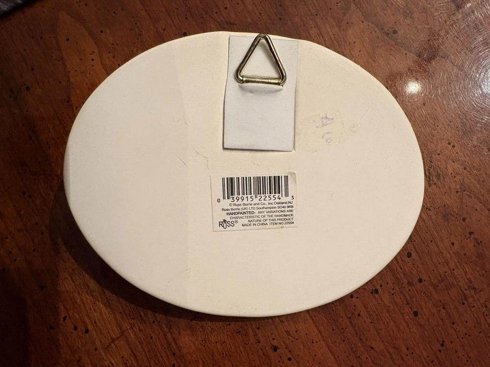 This beautiful hand-painted porcelain plaque by Russ Berrie is the perfect addition to your holiday collectibles. With its intricate design featuring the words "Peace, Love, Joy", this plaque is sure to bring a touch of elegance to any room. Made from high-quality porcelain, and ceramic, this plaque is durable and long-lasting. Its weight is 6.2 oz, 4 inches in height and 5 inches in length. This plaque is pre-hung, perfect for hanging on a wall or displaying on a shelf.