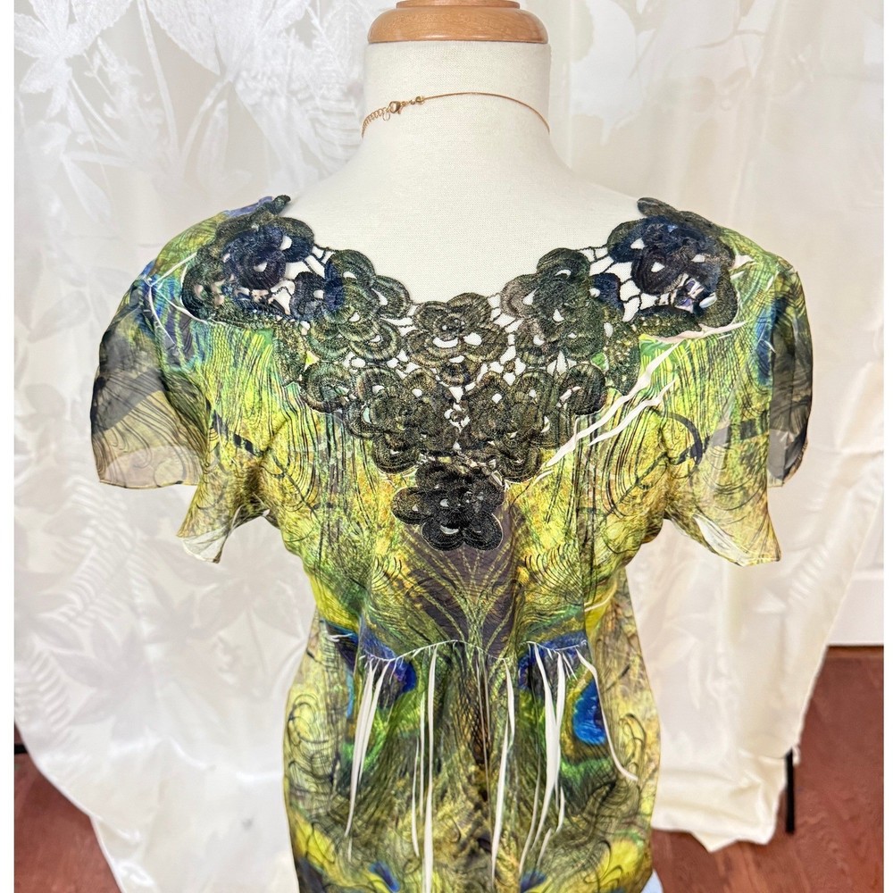 Women's top with a vibrant peacock feather print and rhinestones. Measurements: • Bust: 18 in • Length: 25 in Type: Blouse Department: Women Style: Tunic Material: Polyester, Spandex Neckline: V-Neck Sleeve Length: Short Sleeve Sleeve Type: Flutter Sleeve Pattern: Animal Print Accents: Rhinestone, Beaded Theme: Bird Features: Lightweight, Contrasting Trim Fit: Regular Fabric Type: Mesh Occasion: Casual, Party/Cocktail Keywords: peacock print, feather print, v neck top, short sleeve, rhinestone accent, lace trim, women's top, casual top, statement top, printed blouse, unique print, fashion top, summer top, spring top