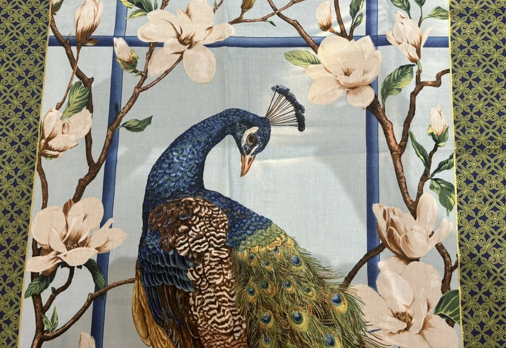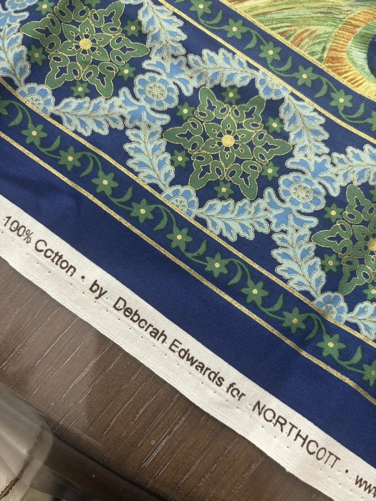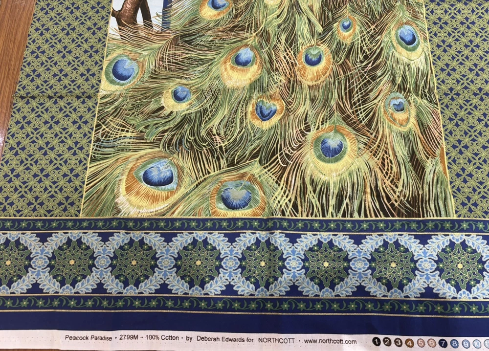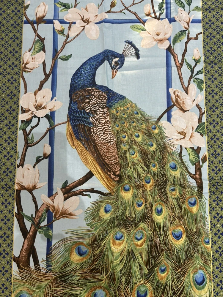 Gorgeous quilt panel or wall hanging. Peacock Paradise Panel Gold Metallic by Deborah Edwards for Northcott Fabrics. Panel size is 23x44 inches. 100% cotton fabric. Quilt and fashion weight.