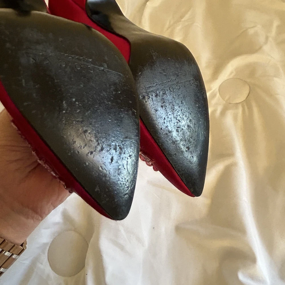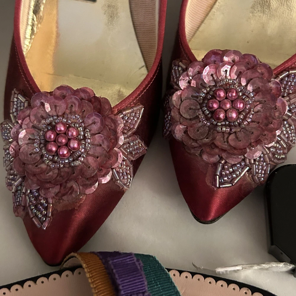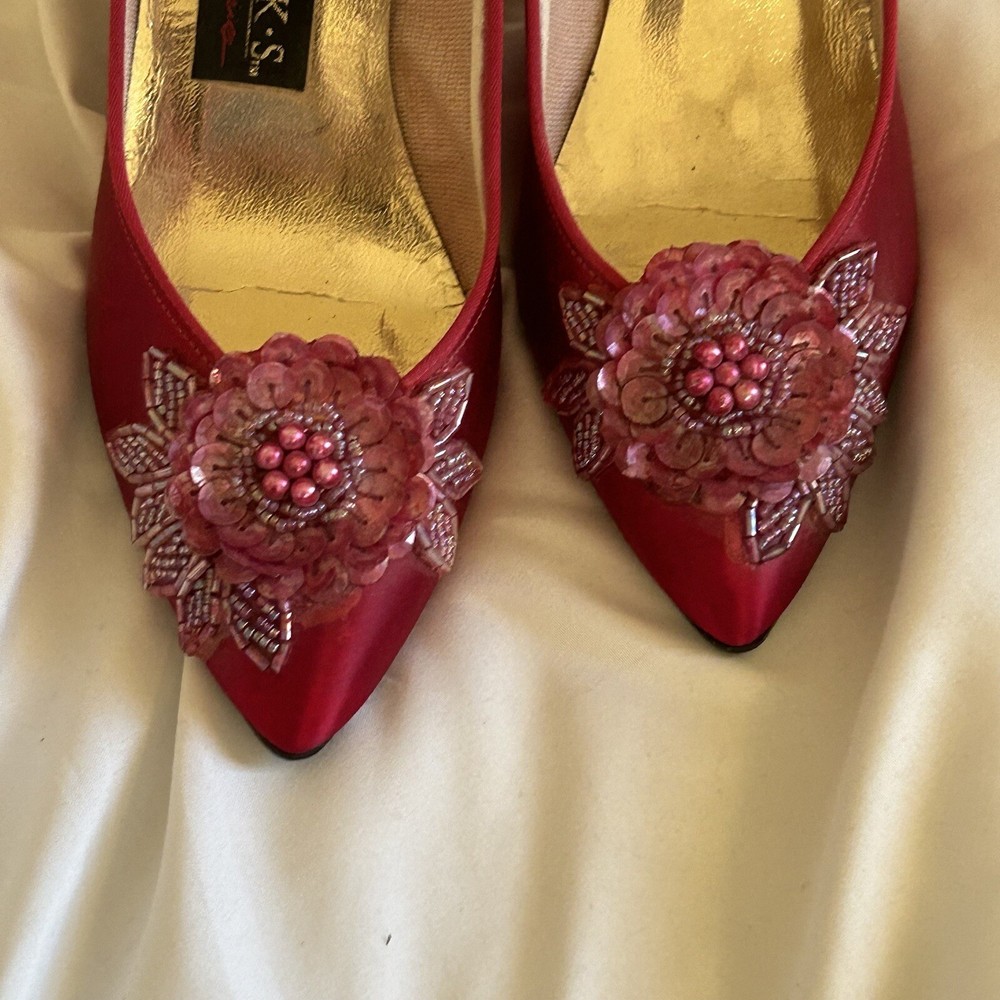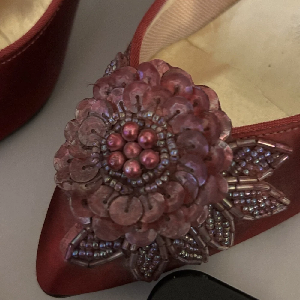 Brand: Peacocks Department: Women Type: Heel Accents: Beaded Theme: Flower Toe Shape: Pointed Toe Pattern: Floral Style: Pump Upper Material: Silky Feel Model: Flowers Color: Burgundy US Shoe Size: 7.5