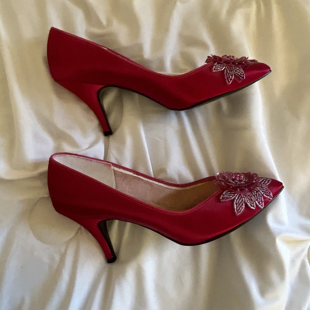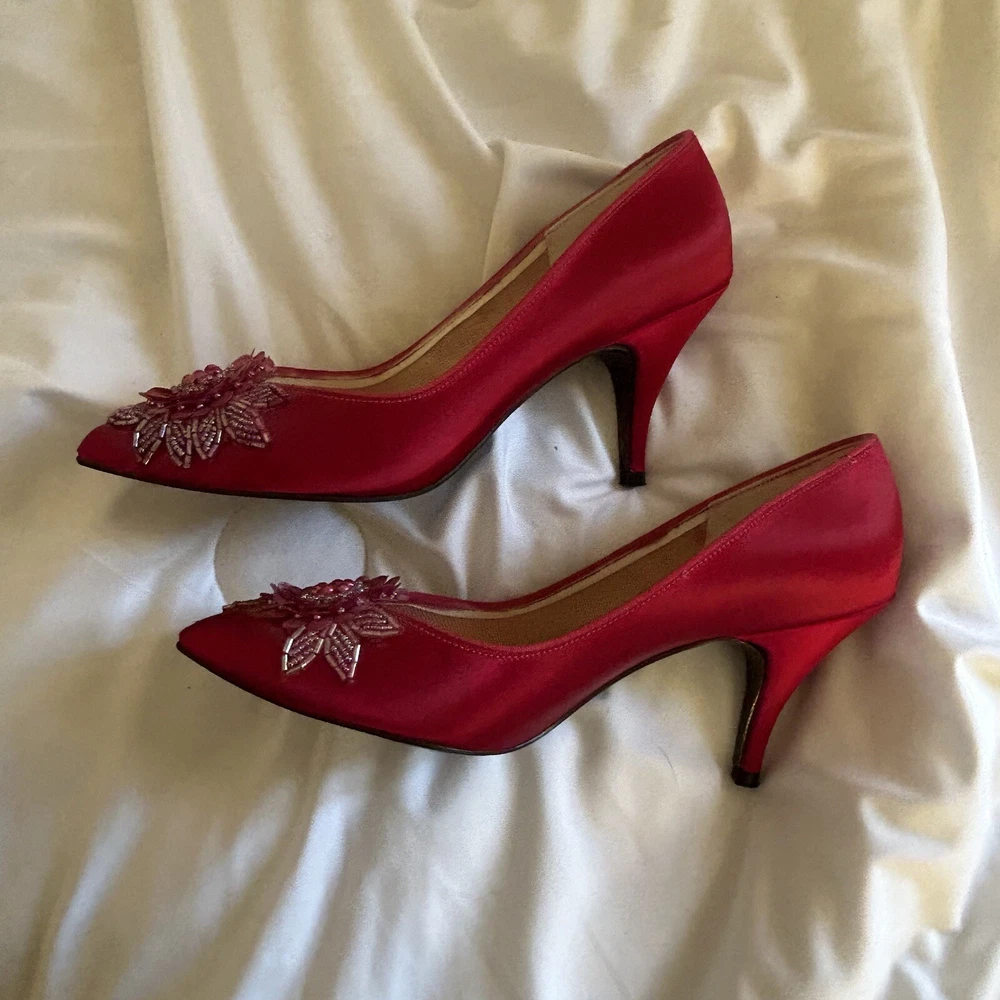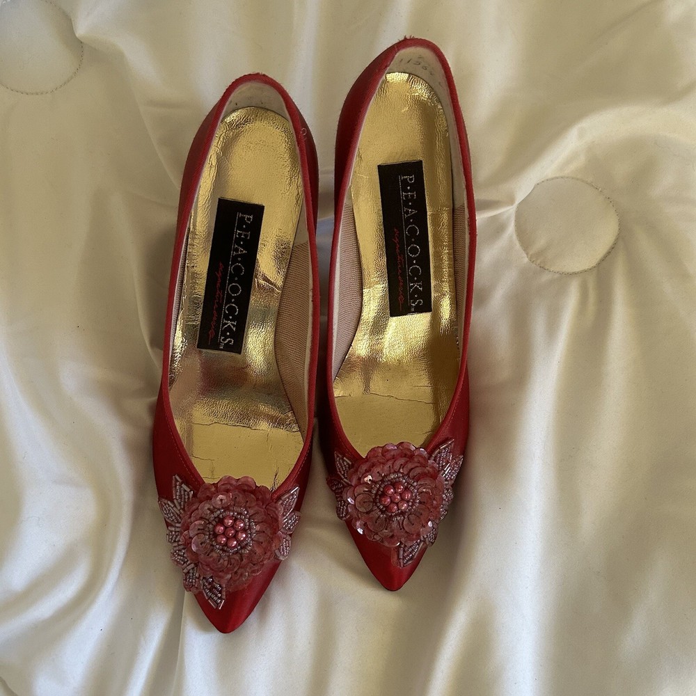 Peacocks Signature Series VTG Floral Beaded Satin Point Toe Heels Women Sz 7.5 in goo vintage condition/ not my size but looks like it may run half a size smaller than actual size/ all beads still intact/ the stain material has some darker discoloration but it’s not too noticeable considering it the material has a sheen it 3.5” heel All final sale Party, wedding, date , dancing, dress up, vintage heels, rockabilly flapper, pin up. Vintage feminine