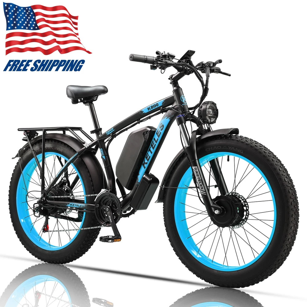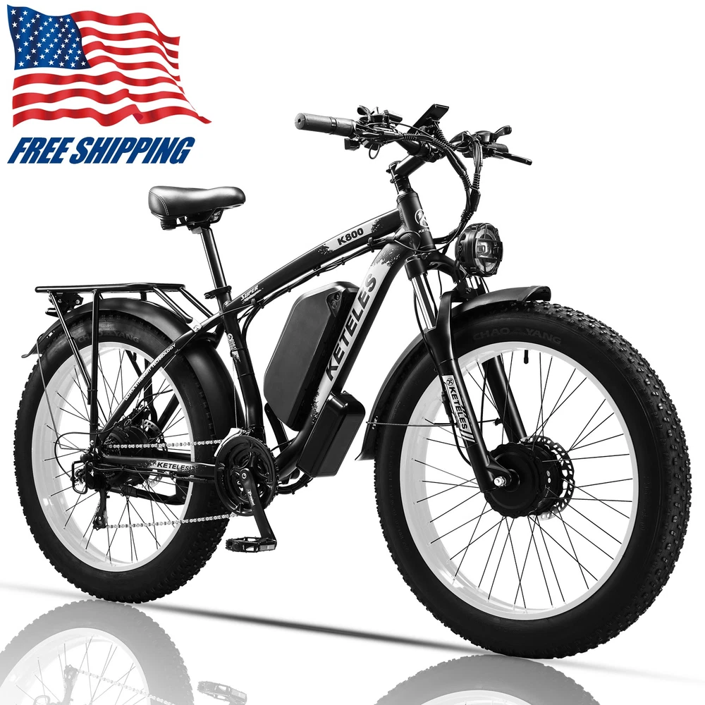 Peak 4000W Dual Motor Electric Bicycle 26" Fat Tire KETELES 48V/23Ah for Adults Note: Our products have been certified under UL2849 safety standards. About this item: *Powerful Motor E-bike: The K800 is a powerful all-wheel drive electric bike for adults. 2000W brushless motor (1000W front and rear) with Shimano 21-speed gear for an easy ride, with a top speed of about 33~35MPH , with a long range of more than 40 miles. Equipped with 48V, 23AH detachable lithium battery, so you can bring the battery to your home or office to recharge. Charging time: Approximately 5-8 hours, 2000 cycles of charging. *Fat Tires 26"x4.0" Ebike: Fat Tire and front suspension to ride smoothly on any terrain, including rocky roads, sandy beaches, snowy suburbs and so on. *Hydraulic Disc Brakes: The front and rear hydraulic brake system with power-off function offers an easy brake within 2 seconds, which provide more effective braking in rainy weather, heavy off-road, long downhill, high-speed riding and adverse conditions, stop the e-bike quickly and smoothly. Equipped with 21 speed gears, more accurate and stable. The lockable aluminum suspension front fork has a good shock absorption effect, which can offer you safer and comfortable riding experience. *Smart Display: Mileage 5-speed LCD display computer shows your speed per hour, total distance and remaining battery power for a better riding experience. You can then control the display of miles or kilometers as a unit of speed or mileage through the settings menu. *5 Riding Modes: This electric bike offers a range of riding modes to suit your preferences. You can choose from pure electric mode, pedal assist mode, classic bike mode, and walking mode or even activate cruise control mode for easy riding. Each mode has its own unique benefits, allowing you to enjoy a customized riding experience every time. *Easy installation: 85% of the bike is pre-installed, you only need to manually install a few simple accessories. *1 Year Warranty: We provide 1 year warranty. If you have any questions about this item please directly contact us. Warm Tips: * New electric bike passes road test before packing, therefore dust on the tires is inevitable. * Upon arrival, mark down the serial number, which locates on the middle axle tube, and register to vehicle management center. It is necessary to track your ebike while preventing loss. * Please be aware of the height of electric bike. * It refers to the peak power of the motor reaching 4000W and the total wattage of the motor being 2000W. Specification: Bike Type E-Bike Age Range Adult Brand KETELES Number of Speeds 21 Color Black-Blue / Black-Green / Black-Yellow / Black-White Wheel Size 26"x4.0" Brake Style Disc Frame 6061 Aluminum Alloy Frame Brake Hydraulic Brake with Power Cut-off Feature Fork Aluminum Alloy Suspension Fork with Lockout Throttle Twist Throttle on the Right side of Handlebar Display Smart LCD display that shows speed, battery status, pedal assist level, etc. Range Fully Electric Mode Range: around 40~60km Pedal Assist Mode Range: around 70~90km Voltage 48 Volts (DC) Model Name K800 Wattage 2000 watts Front Motor 48V 1000W Brushless Geared Hub Motor Rear Motor 48V 1000W Brushless Geared Hub Motor Item Weight 38kg Maximum Weight Recommendation 200 Kilograms Warranty 1 year Suggested Users Unisex-adult Package Included: *1 x Electric bicycle *1 x Headlight *1 x Phone-holder *2 x Fenders *1 x Charger *1 x Battery *1 x Tool kit *8 x Tools *2 x Pedals *1 x Taillight *1 x Rear rack *1 x Air cylinder *1 x Lock 48V 1000W*2 75N.m Powerful Motor The high-speed brushless gear hub motor is a highly efficient and advanced motor that offers several benefits for riders. It has a simple structure, low noise, low energy consumption, and excellent riding experience. Moreover, it is easy to maintain, has remarkable waterproof performance, and adapts to various weather and terrain conditions. LED Headlights Ride at night, safe and sound! Bicycle front LED light, illuminate your every step! This bicycle front light has a super strong LED lamp, which can emit dazzling light in the dark night, clearly showing your front road condition, ensuring your safety when riding at night. No need to worry about the dangers of riding at night. Electronic Tail Lights and Full Coverage Fenders The bolded rear frame can bear more weight, the full-cover fender protects the rider from being splashed by mud and water during riding, and the bright electronic tail light helps to ensure night riding safety, reminding other traffic participants to pay attention to the rider and prevent accidents. System of riding It has a complete riding assistance system, and it can switch easily among different riding modes, to handle various riding environments. Shimano 21-Speed According to the road conditions and their objectives, riders can change different gear proportions to enhance riding and climbing efficiency. The shifting is precise, the chain does not slide or drop off, suitable for all kinds of terrains, speed can be freely altered. Aluminum Suspension Fork The suspension fork resists the bumps on the road, making the journey comfortable. It sensitively absorbs and alleviates shocks, enhancing the comfort and stability of riding, making the ride smooth and precise, allowing the rider to confidently handle various terrains, reducing the interference of bumps. The powerful and lockable aluminum alloy fork has high strength, light weight, corrosion resistance, more durable and safe. Disc brake system Front and rear hydraulic disc brake system, with power-off function, quickly and smoothly stopping. 2 larger and thicker 180mm disc rotors, providing more effective braking power, more confident downhill. Payment Delivery details Terms of sales About us Contact us Payment We accept Credit Card, Debit Card and eCheck payments through Payoneer. Delivery details 1. Thank you very much for purchasing our products. 2. All the items double checked well packed bafore 