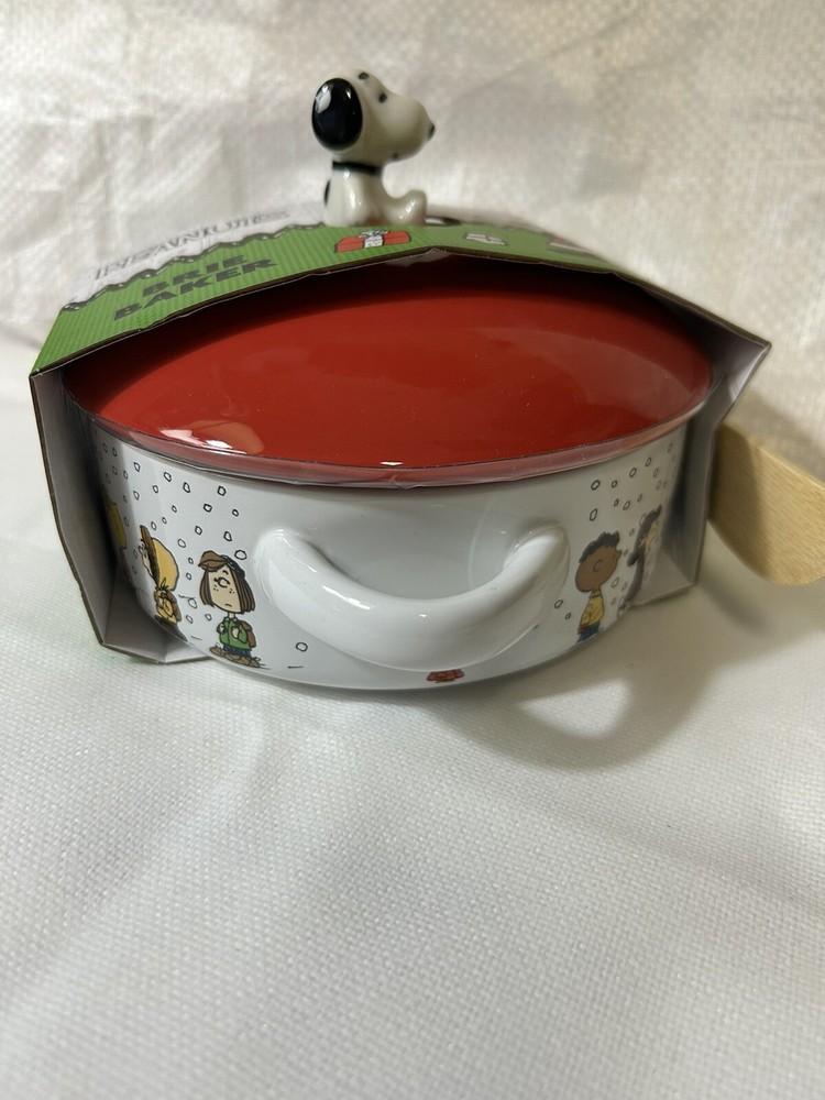 This unique Peanuts Charlie Brown & Gang Christmas Brie Baker is sure to delight any fan of the classic cartoon. The ceramic brie baker features a colorful design with Snoopy and the gang, and comes with a wooden spoon for easy serving. It's perfect for collectors or anyone looking for a fun and festive addition to their kitchen. The brie baker is manufactured in China and is part of the Peanuts franchise. It's a great gift for anyone who loves the show or collects animation merchandise. Get ready to show off your love for Snoopy and the gang this holiday season with this charming brie baker.