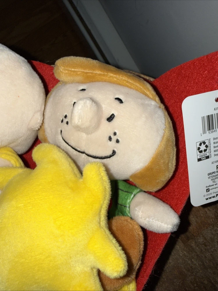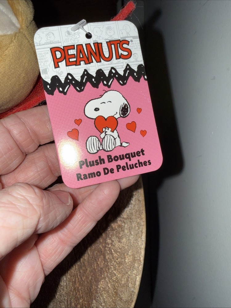The product is a 16" Peanuts Valentine's plush bouquet featuring characters from the franchise including Snoopy, Woodstock, Charlie, and Lucy. Made of plush material and in multicolor, this collectible item is perfect for fans of the Peanuts series. The bouquet captures the essence of the beloved characters in a cute and cuddly form, making it a delightful addition to any animation merchandise collection.