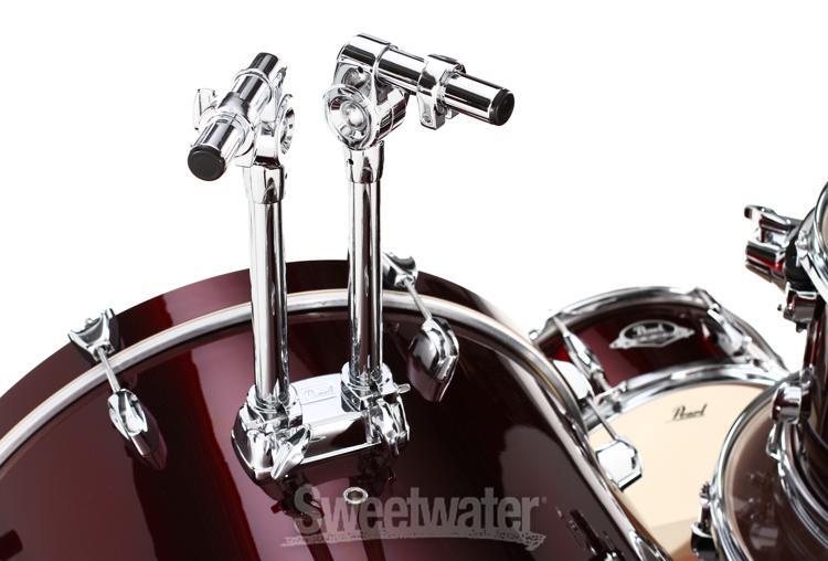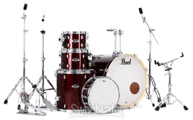 Own One of the World's Most Popular Drum Kits Upgraded shells, hardware, and more make this Pearl Export 5-piece drum set an upgraded version of one of the most popular and affordable drum kits around. Inspired by Pearl's Reference series, this Export kit's Superior Shell Technology (SST) uses a combination of strategically arranged plies of premium wood and proprietary construction techniques to offer you a durable shell that maximizes frequency response. The Opti-Loc mounting system keeps your toms wobble-free while reinforcing the resonance of the kit. The included 830 series hardware adds big bang for the buck with the Pearl Export drum kit. All you need to do is add the cymbals!Superior Shell Technology The Pearl Export 5-piece drum kit's poplar and Asian mahogany shells are constructed using Pearl's proprietary Superior Shell Technology. This construction method incorporates Pearl's trademarked Acoustiglue, which is boiled into the shells and pressed at over Sweetwater is an Authorized Pearl Dealer Genuine New Item Sweetwater's 2-year warranty Pearl Export 5-piece Drum Set with Snare Drum - Burgundy 5-piece Drum Kit with 10" and 12" Toms, 16" Floor Tom, 22" Bass Drum, and 14" Snare - Burgundy Own One of the World's Most Popular Drum Kits Upgraded shells, hardware, and more make this Pearl Export 5-piece drum set an upgraded version of one of the most popular and affordable drum kits around. Inspired by Pearl's Reference series, this Export kit's Superior Shell Technology (SST) uses a combination of strategically arranged plies of premium wood and proprietary construction techniques to offer you a durable shell that maximizes frequency response. The Opti-Loc mounting system keeps your toms wobble-free while reinforcing the resonance of the kit. The included 830 series hardware adds big bang for the buck with the Pearl Export drum kit. All you need to do is add the cymbals! Superior Shell Technology The Pearl Export 5-piece drum kit's poplar and Asian mahogany shells are constructed using Pearl's proprietary Superior Shell Technology. This construction method incorporates Pearl's trademarked Acoustiglue, which is boiled into the shells and pressed at over 1,000 pounds of hydraulic pressure, making the shell act and resonate as a single ply. SST uses precision-cut scarf joints to join the seams of the shells, offering over 800% more contact area than standard butt joints. This technology makes these drums so durable that they come with a limited lifetime warranty from Pearl. To make these shells sound even better, Pearl outfitted them with new lugs that minimize shell interaction for maximum resonance and sustain. Opti-Loc mounting system reduces wobble and improves resonance Pearl Export series Opti-Loc mounting system features a triangular design with two tension rod attachment points that hold your toms firmly in place with no wobble. Pearl places rubber isolators at all of the connection points to allow the shells to vibrate freely for more sustain and resonance. The Opti-Loc mounting system keeps your toms right where you need them and sounding their best, whether you're practicing at home or recording drum tracks at a studio. Included Pearl 830-series hardware and P-930 pedal The high-quality 830 series hardware included in this Pearl Export EXX 5-piece drum kit is a sophisticated addition. Utilizing infinitely adjustable Uni-Lock tilters, you have the ability to position your cymbals and snare drum precisely. The 1-inch base tubes and 0.87-inch center tubes with double-braced tripods are exceptionally sturdy. The included P-930 bass drum pedal combines Pearl's Demon Drive pedal with their Eliminator interchangeable cam technology to dial in your power and control. Pearl Export 5-piece Drum Set Features: SST construction for durability and tone Hand-selected mahogany/poplar shells Opti-Loc mounting system for wobble-free performance and improved resonance 830 series hardware is easy to position and very stable P-930 drum pedal combines 2 popular Pearl designs Specification Detail Finish Burgundy Wrap Configuration Drum Kit Number of Drums 5 Snare (Depth x Diameter) 5.5" x 14" Mounted Toms (Depth x Diameter) 7" x 10", 8" x 12" Floor Toms (Depth x Diameter) 16" x 16" Bass Drums (Depth x Diameter) 18" x 22" Shell Material Asian Mahogany/Poplar Hybrid Included Stands 1 x Cymbal Boom Stand, 1 x Cymbal Straight Stand, 1 x Hi-hat Stand, 1 x Snare Stand Included Drum Pedal 1 x P-930 Single Kick Pedal Tom Holders 2 x TH70I Tom Arms RETURN INFORMATION We want you to be completely happy with your purchase from Sweetwater. If you are not satisfied with your product, you may return it for a refund of the purchase price within 30 days. If your purchase was eligible for Free Shipping, the shipping cost will be deducted from your credit or refund. Returns must be in the complete and original packaging with all accessories and complete documentation (Owner's Manual, warranty card, quick start guides, etc.), show no signs of wear or use, and include a Return Authorization number or be subject to a restocking fee.