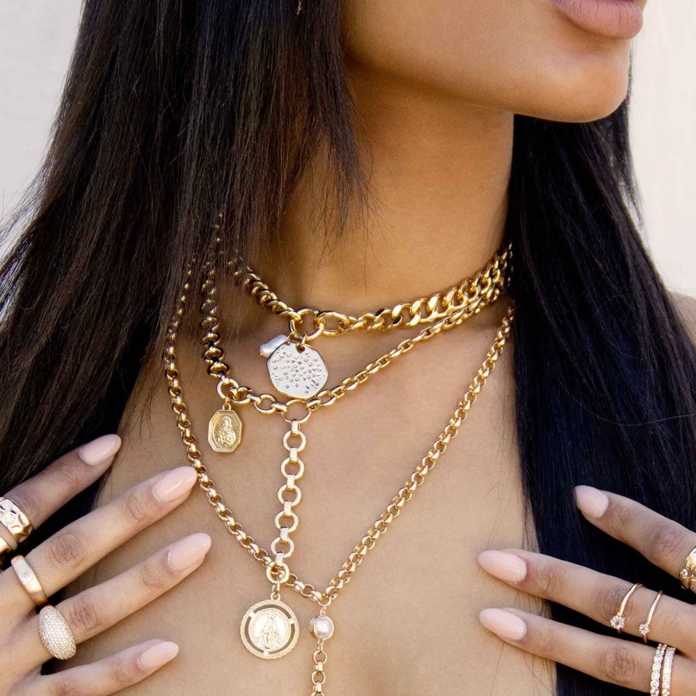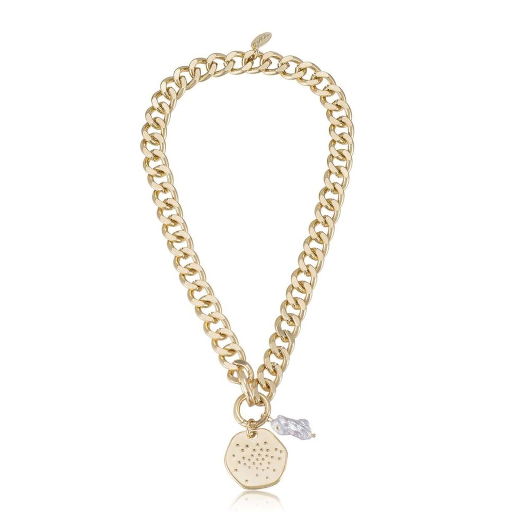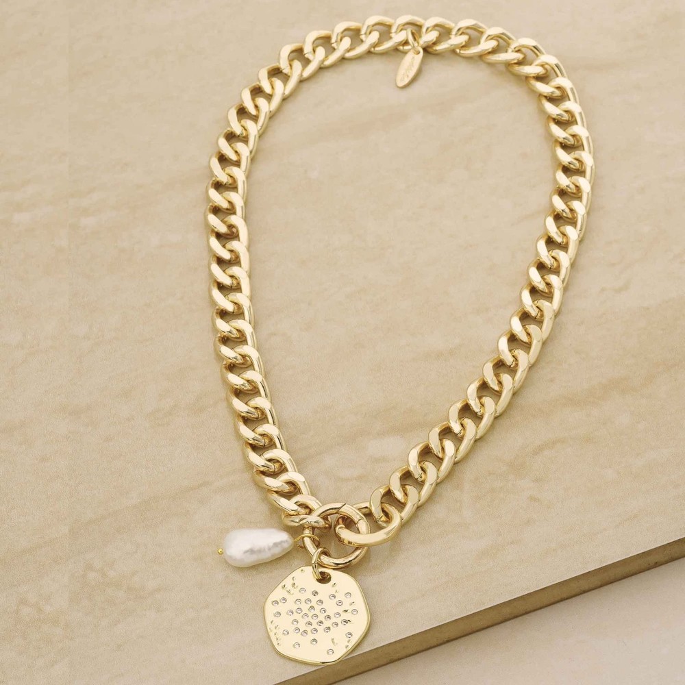 Lola pearl and medallion link chain necklace, plated in radiant 18k gold. This thick link necklace redefines opulence with its intricate medallion pendant adorned with luminous pearls, suspended from a substantial thick chain. Whether it's a formal occasion or a chic ensemble, this necklace effortlessly enhances your style. Embrace the art of refined luxury with this necklace from , a symbol of timeless allure that captures attention with its grandeur. MINIMALIST DESIGN - Elegant for easy wear. This chain choker necklace will become your go-to piece for every event! Stunning stackable fashion jewelry. PREMIUM MATERIALS - Made of 18k Gold Plated, brass, steel, freshwater pearl, and cubic zirconia will not cause any allergies to your skin, lightweight and comfortable for daily wear. DETAILS MATTER - Chain length measures 14 inches to create the look you want to complete and complement your outfits. Great for any occasion. WE ARE - We believe in affordable luxury, founded on the fundamental element of quality, authenticity, and design. We design jewelry to help women look and feel their best - because we know a woman’s best accessory is her confidence. MEANINGFUL GIFT - Jewelry is essential to accessorize and elevate any outfit any day of the week. Functional and enjoyable gift for your lover, girlfriend, daughter, mother, sister, wife. necklaces make a great Birthday Gift , Wedding Anniversary Gift, Christmas Gift, Valentine's Day Gift, Mother's Day Gift.