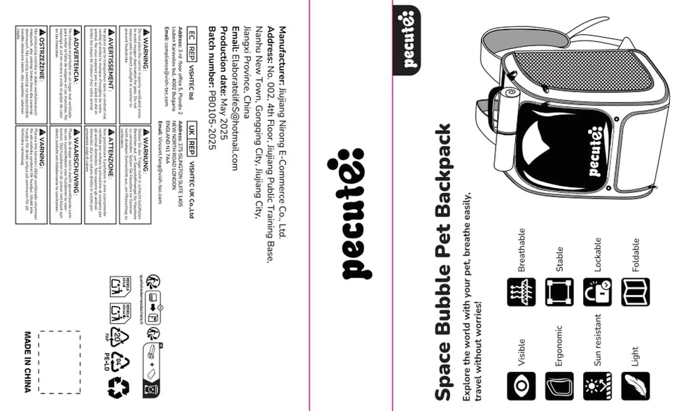 Pecute Cat Backpack Carrier, Large Space Cat Bubble Backpack, Breathable Cat Carrier, Shaded Dog Backpack Carrier, Ergonomic 3D Design for Travel, Hiking, Suitable for Shopping, and Vet, Gray Product Details Color: Gray Brand: Pecute MPN: PB-SCB01 UPC: Does not apply EAN: Does not apply Color: Gray Brand: Pecute Product Dimensions: 12.6"L x 10.2"W x 16.5"H Material: Nylon, Metal zipper with lock, Smooth transparent plastic shell Special Feature: no squeezing of pets, Soft and supportive padding can be removed for machine washing easly, extremely breathable, large space, Clear windows with wide views See more Product Dimensions : 18.11 x 10.24 x 12.6 inches; 3.22 Pounds Item model number : PB-SCB01 Date First Available : July 2, 2025 Manufacturer : Pecute Country of Origin : China Best Sellers Rank: #9,836 in Pet Supplies (See Top 100 in Pet Supplies) #14 in Dog Carrier Backpacks #14 in Dog Carrier Backpacks Customer Reviews: 4.7 4.7 out of 5 stars 52 ratings Item Weight: 3.21 pounds Manufacturer: Pecute Country of Origin: China Item model number: PB-SCB01 Date First Available: July 2, 2025 Item Package Dimensions L x W x H: 17.44 x 12.17 x 3.82 inches Item Dimensions LxWxH: 18.11 x 10.24 x 12.6 inches Brand Name: Pecute Target Audience Keyword: house-cats, dogs Directions: The cat backpack comes with a double-sided protective film. Please find the opening along the edge and tear it open before use., The cushion can be removed for machine washing, Take your pet hiking, climbing, shopping, walking, traveling, and seeing a veterinarian Warranty Description: 1 year Model Name: PB-SCB01 Color: Gray Size: 12.6"L x 10.2"W x 16.5"H Material: Nylon, Metal zipper with lock, Smooth transparent plastic shell Age Range Description: Adult Care Instructions: PB-SCB01 Number of Items: 1 Style: Pet mobile safe house-Cat Bubble Backpack Included Components: one of cat bublle backpack Pet mobile safe house: This cat bubble backpack is strong and wide, with durable fabric, large space and convenient storage. It can not only resist animal bites, but also prevent the cat backpack from collapsing and squeezing the pet. All zippers are equipped with locks,and built-in safety leash ensuring the safety of pets and preventing them from escaping, while also allowing owners to take their pets out with peace of mind. Breathable cat backpack that can block UV rays: The large mesh on both sides of the cat carrier allows natural wind to pass through easily, making the air inside the backpack smooth and comfortable. Lowering the waterproof sunshade can block UV rays from directly entering the cat bag. Comfortable Carrying Experience: There is no pulling feeling when carrying the cat, and you dont need to bend down when carrying it. The one-piece 3D printed back panel fits the back and improves the breathability of the back. A good cat backpack not only serves pets, but also serves pet owners. Thoughtful Features: Includes front and side storage pockets for carrying pet essentials, snacks, leashes, waste bags, or medical records. The pet backpack is foldable for easy storagewhen folded, it becomes slim enough to fit into a drawer, saving space. Comfortable and soft padding brings a good outing experience for pets. The padding can be removed for machine washing easly.