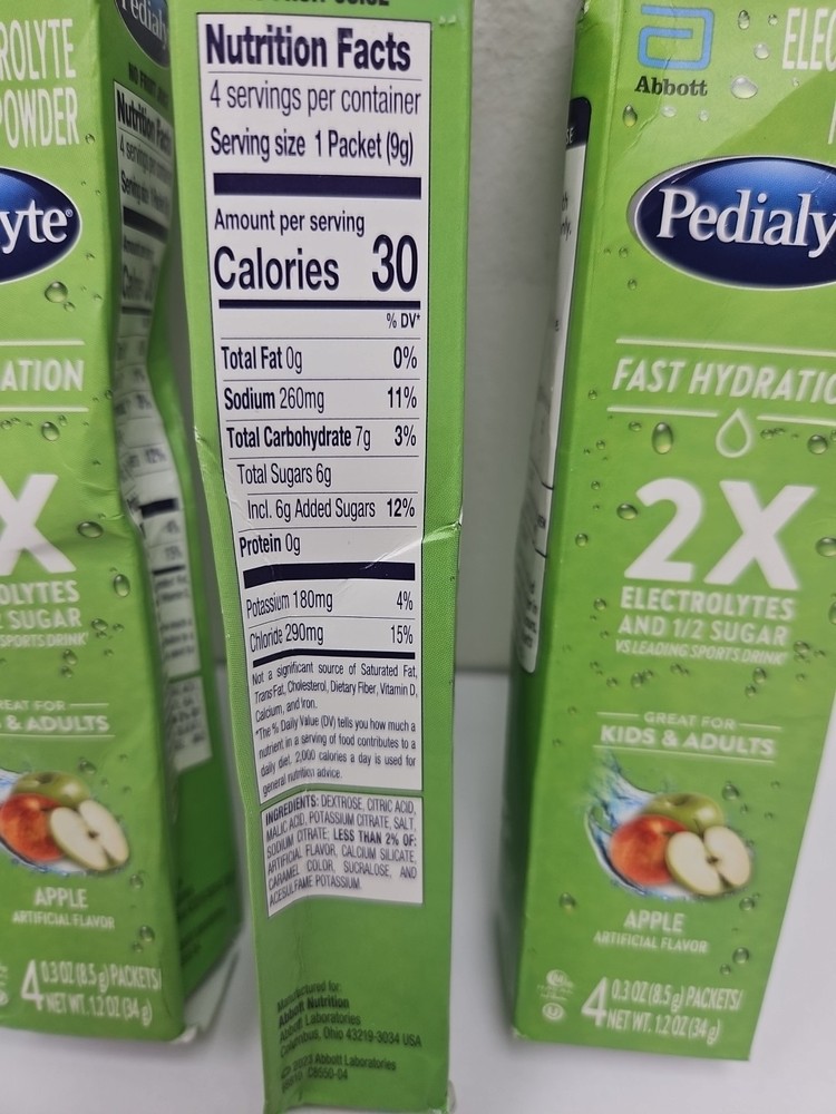 4 Boxes Pedialyte 2x Electrolyte Powder, Fast Hydration, APPLE FLAVOR 16 Total packs. 4 PER BOX FREE SHIPPING ANY FURTHER QUESTIONS PLEASE FEEL FREE TO ASK. SHIPPING: WE REGULARLY SHIP OUT SAME DAY NEXT DAY EXCEPT ON WEEKENDS IT WILL GO OUT MONDAY. OUR ITEMS HAVE DELIVERY CONFIRMATION NUMBERS . WE DO COMBINE SHIPPING WHERE APPLICABLE SO PLEASE CHECK OUT OUR OTHER GREAT ITEMS IN OUR STORE. RETURNS: WE DO OFFER RETURNS. IF YOUR ITEM IS NOT TO YOUR SATISFACTION BECAUSE OF A MISTAKE BY US WE WILL GLADLY REFUND YOUR MONIES ONCE THE ITEM IS RETURNED. ITEM MUST BE RETURNED IN ORIGINAL PACKAGING UNOPENED FOR FULL REFUND. WE WILL NOT REFUND FOR ANY OTHER REASON. FEEDBACK: WE VALUE OUR BUSINESS WITH THE EBAY COMMUNITY. IF YOU HAVE A SITUATION THAT YOU ARE UNHAPPY WITH PLEASE CONTACT US FIRST SO WE CAN WORK WITH YOU TO FIX THE SITUATION. FEEDBACK IS AS IMPORTANT TO YOU AS IT IS TO US. UNFORTUNATELY A LOT OF PEOPLE DON'T LEAVE FEEDBACK AND GET UP SET AND LEAVE NEGATIVE FEEDBACK BEFORE TRYING TO WORK ANYTHING OUT WITH THE SELLER. WE WILL LEAVE FEEDBACK ONCE THE BUYER LEAVES FEEDBACK AND WE KNOW THAT THEY ARE HAPPY. THANKS AND HAPPY BUYING