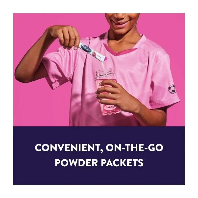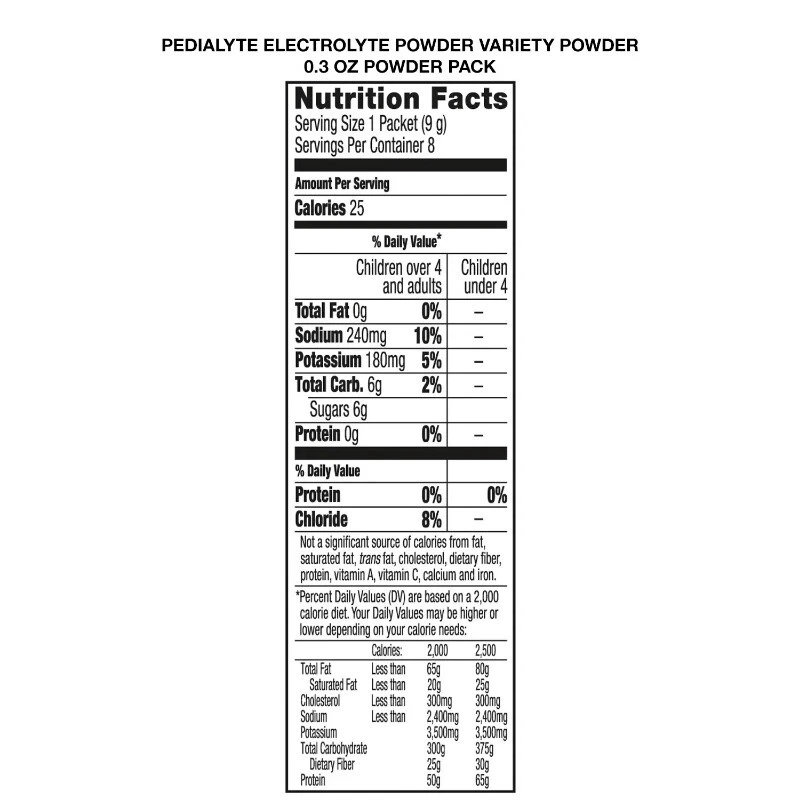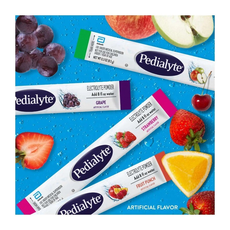 Pedialyte is the #1 doctor-recommended brand for hydration in the US and has been rehydrating families since 1966. Pedialyte electrolytes powder packets have 2x the electrolytes and 50% less sugar vs the leading sports drink.* When you’re dealing with dehydration† due to vomiting, diarrhea, extreme heat, exercise, and travel, try Pedialyte. Just mix 1 electrolytes powder packet with 8 fl oz of water, then stir or shake until dissolved. It’s great for kids and adults. These hydration packets provide a convenient on-the-go option to help replace electrolytes so you can feel better fast. * Pedialyte Classic powders have 1100mg sodium and 25g sugars per liter; leading sports drink has ~460mg sodium and ~58g sugars per liter. † Mild to moderate dehydration Pedialyte Electrolyte Powder, Variety Pack: Grape, Strawberry, Fruit Punch, and Apple, 24 Powder Packets Designed to replace fluids & electrolytes more effectively than common beverages like some sports drinks 2x the electrolytes and 50% less sugar vs the leading sports drink* Pedialyte is the #1 doctor-recommended brand for hydration Keeps you hydrated longer than water Powder packets are convenient and great for kids and adults Has 3 key electrolytes for rehydration: sodium, chloride, and potassium Variety Pack features Fruit Punch, Grape, Apple, and Strawberry electrolyte powder packets