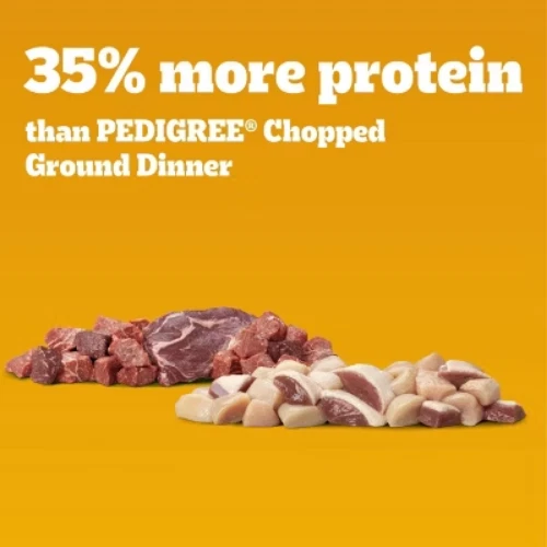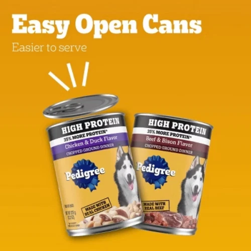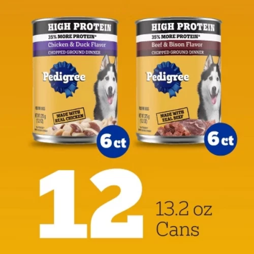 Important Note for Our Valued Customers: To offer you the best prices with free shipping, we occasionally experience shipping delays. If this happens, we’ll notify you immediately, issue a full refund, and invite you to place a new order at your convenience. To keep costs low, we sometimes reuse branded packaging boxes for shipments—we appreciate your understanding if you receive your order in repurposed packaging. Rest assured, all products we sell are 100% brand new, unopened, and freshly manufactured, including pet food and human-grade items, with a minimum 8-month shelf life remaining. If any issues arise, please contact us first—we’re committed to resolving them quickly. If you’re not completely satisfied, we offer a full refund with no hassle. Thank you for your trust and support! Description Dogs bring out the good in us. Pedigree brings out the good in them. Express your love for your dog by serving Pedigree High Protein. Pedigree High Protein Wet Dog Food, Chicken Duck & Beef Bison Flavors Multipack comes with two recipes: Chicken & Duck Flavor and Beef & Bison Flavor. Each is made with real chicken or beef for a familiar flavor your dog will appreciate. This nutrient rich recipe is 100% complete and balanced for adult dogs. It is made without added sugar, high fructose corn syrup, and artificial flavors. Pedigree High Protein is crafted with 35% more protein than Pedigree Choice Cuts. This wet dog food helps add moisture to keep your dog hydrated. Additionally, it is made in the USA with the finest ingredients from around the world, so you can be confident you’re feeding your dog a quality recipe they will love. highlights 12 Pack: Contains six (6) 13.2 oz. cans of Pedigree High Protein Adult Soft Wet Dog Food Chicken & Duck Flavor and six (6) 13.2 oz. cans of Beef & Bison Flavor. 100% Complete and Balanced: This canned wet dog food is 100% complete and balanced for adult dogs, providing the nutrients they need. Made With Real Meat: Pedigree High Protein Wet Dog Food, Chicken Duck & Beef Bison Flavors Multipack is made with real chicken and beef. High Protein: This canned wet dog food is made with 35% more protein than Pedigree Choice Cuts. Fine Ingredients: Pedigree High Protein Wet Dog Food, Chicken Duck & Beef Bison Flavors Multipack is made in the USA with the finest ingredients from around the world. Hydration: Pedigree High Protein Adult Soft Wet Dog Food helps add moisture to keep your dog hydrated. Feed the Good. Adopt: The Pedigree brand believes all dogs make the world a better place. Every dog deserves a loving home. Ingredients: beef & bison flavor: chicken, meat by-products, water, beef, brewers rice, minerals (potassium chloride, magnesium proteinate, zinc sulfate, sodium selenite, copper proteinate, manganese sulfate, copper sulfate, potassium iodide), dried yam, carrageenan, sodium tripolyphosphate, xanthan gum, vitamins (choline chloride, vitamin e supplement, thiamine mononitrate, calcium pantothenate, biotin, riboflavin, vitamin a supplement, vitamin d3 supplement, vitamin b12 supplement), natural bison flavor, guar gum. chicken & duck flavor: meat by-products, chicken, water, brewers rice, minerals (potassium chloride, magnesium proteinate, zinc sulfate, sodium selenite, copper proteinate, manganese sulfate, copper sulfate, potassium iodide), dried yam, carrageenan, sodium tripolyphosphate, xanthan gum, vitamins (choline chloride, vitamin e supplement, thiamine mononitrate, calcium pantothenate, biotin, riboflavin, vitamin a supplement, vitamin d3 supplement, vitamin b12 supplement), natural duck flavor, guar gum, yellow #6, yellow #5.