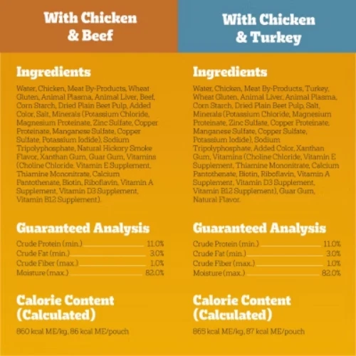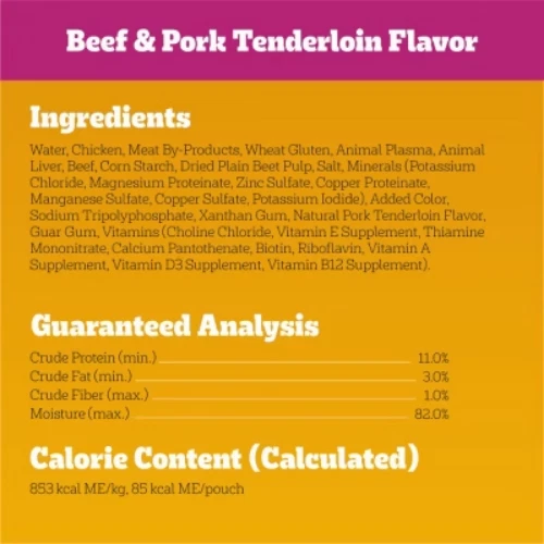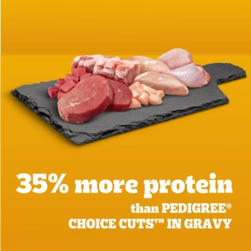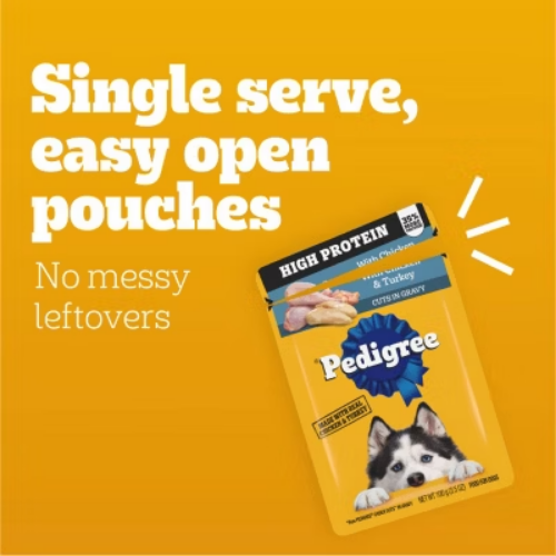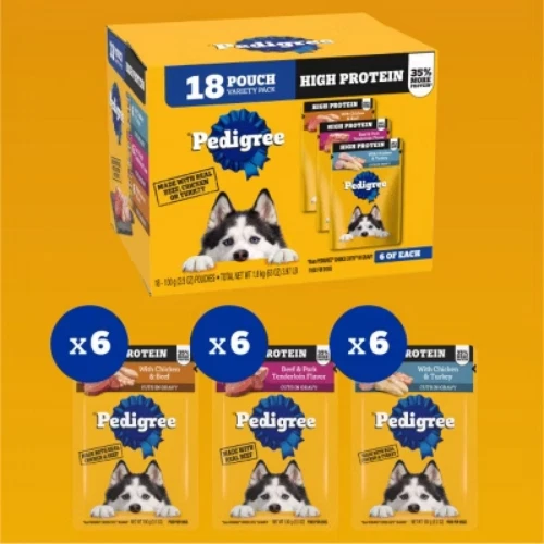 Important Note for Our Valued Customers: To offer you the best prices with free shipping, we occasionally experience shipping delays. If this happens, we’ll notify you immediately, issue a full refund, and invite you to place a new order at your convenience. To keep costs low, we sometimes reuse branded packaging boxes for shipments—we appreciate your understanding if you receive your order in repurposed packaging. Rest assured, all products we sell are 100% brand new, unopened, and freshly manufactured, including pet food and human-grade items, with a minimum 8-month shelf life remaining. If any issues arise, please contact us first—we’re committed to resolving them quickly. If you’re not completely satisfied, we offer a full refund with no hassle. Thank you for your trust and support! Description Dogs bring out the good in us. Pedigree brings out the good in them. Express your love for your dog by serving Pedigree High Protein Adult Wet Dog Food 18-Count Variety Pack. These great-tasting wet dog food recipes are 100% complete and balanced food for adult dogs and are made with real beef, chicken, and turkey, bringing a filling and familiar flavor to mealtime. Pedigree High Protein Adult Wet Dog Food 18-Count Variety Pack features three delicious options: With Chicken & Turkey Cuts In Gravy, Beef & Pork Tenderloin Flavor Cuts In Gravy, and With Chicken & Beef Cuts In Gravy. Made to be versatile, this soft dog food can be served as a topper, mixed with dry dog food, or enjoyed by itself as a complete meal for adult dogs, bringing your dog a variety of ways to indulge. Crafted with no high fructose corn syrup, artificial flavors, or added sugars, although trace amounts may be present due to potential cross-contact at manufacturing, Pedigree High Protein Adult Wet Dog Food, 18-Count Variety Pack Flavor shows your dog that you care and want them to have great tasting food. highlights Made with Real Meat or Poultry: Pedigree High Protein Adult Wet Dog Food 18-Count Variety Pack is made with real beef, chicken or turkey, serving a flavor your dog will love. 100% Complete and Balanced For Adult Dogs: Pedigree High Protein Adult Wet Dog Food 18-Count Variety Pack is 100% complete and balanced food for adult dogs, keeping your dog full and happy. Mix-it-Up: These soft dog food recipes can be served as a topper, mixed with dry dog food, or as a complete meal for adult dogs, bringing your dog a variety of ways to enjoy. Quality Recipe: This soft dog food contains no added sugar, no high fructose corn syrup and no artificial flavors. Zero Factory Waste to Landfill: Pedigree High Protein Adult Wet Dog Food 18-Count Variety Pack is made in factories committed to zero waste to landfill. 18-Count: Pedigree High Protein Adult Wet Dog Food Variety Pack contains six (6) 3.5 oz. With Chicken & Turkey Cuts In Gravy, six (6) Beef & Pork Tenderloin Flavor Cuts In Gravy, and six (6) With Chicken & Beef Cuts In Gravy. Ingredients: with chicken & beef, cuts in gravy, ingredients: sufficient water for processing, chicken, meat by-products, wheat gluten, animal plasma, animal liver, beef, corn starch, plain dried beet pulp, added color, salt, minerals (potassium chloride, magnesium proteinate, zinc sulfate, copper proteinate, manganese sulfate, copper sulfate, potassium iodide), sodium tripolyphosphate, natural smoke flavor, xanthan gum, guar gum, vitamins (choline chloride, vitamin e supplement, thiamine mononitrate, calcium pantothenate, biotin, riboflavin supplement, vitamin a supplement, vitamin d3 supplement, vitamin b12 supplement)