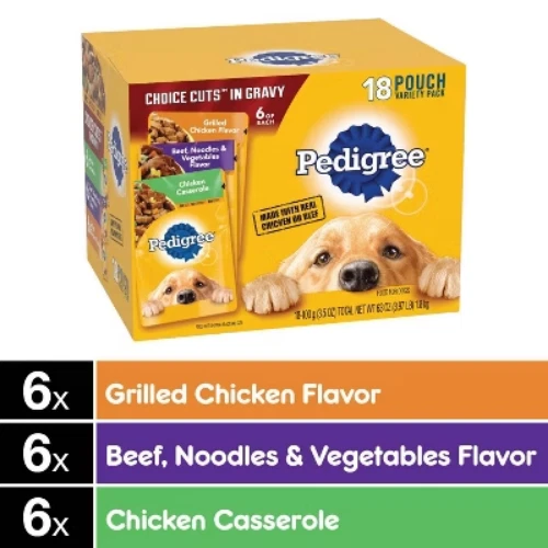 Highlights 100% Complete and Balanced For Adult Dogs: Pedigree Choice Cuts In Gravy Adult Soft Wet Dog Food 18-Count Variety Pack is 100% complete and balanced food for adult dogs, keeping your dog full and happy. Quality Recipe: This soft dog food contains no added sugar, no high fructose corn syrup, and no artificial flavors. Mix-it-Up: These wet dog food recipes can be served as a topper, mixed with dry dog food, or enjoyed as a complete meal for adult dogs, bringing your dog a variety of ways to enjoy. Zero Waste to Landfill: Pedigree Choice Cuts In Gravy Adult Soft Wet Dog Food 18-Count Variety Pack is made in factories committed to zero waste to landfill. 18-Count: Pedigree Choice Cuts In Gravy Adult Soft Wet Dog Food Variety Pack contains six (6) 3.5 oz. Pouches of Hickory Smoked Chicken Flavor, six (6) Filet Mignon Flavor, and six (6) Grilled chicken Flavor. Description Treat your dog to the delicious Grill Inspired Classics! PEDIGREE CHOICE CUTS IN GRAVY adult wet dog food gives dogs the taste they crave with the nutrition they need. This variety pack comes with three flavors your pup will love: Hickory Smoked Chicken, Filet Mignon, and Grilled Chicken. These flavorful, hearty cuts in a delectable gravy sauce make a tasty meal for dogs of all sizes and provide the perfect balance of vitamins and minerals with no artificial flavor, no added sugar, and no high fructose corn syrup. Each recipe is 100% complete and balanced for adult canines, so you know they’re getting the most out of their diet. Serve as a topper, a mixer with dry dog food, or a complete meal! Feed your dog nutritious food for a healthy, happy life with PEDIGREE Pouches.