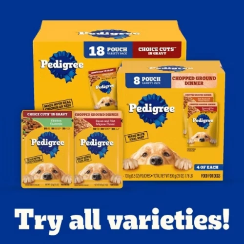 Important Note for Our Valued Customers: To offer you the best prices with free shipping, we occasionally experience shipping delays. If this happens, we’ll notify you immediately, issue a full refund, and invite you to place a new order at your convenience. To keep costs low, we sometimes reuse branded packaging boxes for shipments—we appreciate your understanding if you receive your order in repurposed packaging. Rest assured, all products we sell are 100% brand new, unopened, and freshly manufactured, including pet food and human-grade items, with a minimum 8-month shelf life remaining. If any issues arise, please contact us first—we’re committed to resolving them quickly. If you’re not completely satisfied, we offer a full refund with no hassle. Thank you for your trust and support! Description PEDIGREE CHOPPED GROUND DINNER is the wet dog food that delivers the taste dogs crave with the nutrition they need. This variety pack features three delicious flavors: With Hearty Chicken, With Slow Cooked Beef, and Bacon and Filet Mignon Flavor. This easy-to-chew ground texture makes a tasty meal for adult dogs of all sizes and provides the perfect balance of vitamins and minerals with no artificial flavor, no added sugar, and no high fructose corn syrup. Each dog wet food recipe is 100% complete and balanced for adult canines, so you know they’re getting the most out of their diet. Serve as a topper, a mixer with dry dog food, or a complete meal! Feed your dog nutritious food for a healthy, happy life with PEDIGREE Pouches. highlights 100% Complete and Balanced Food For Adult Dogs: Pedigree Chopped Ground Dinner Dog Food 18-Count Bacon Filet Mignon Variety Pack is 100% complete and balanced food for adult dogs, keeping your dog full and happy. Quality Recipe: These soft dog food recipes contain no added sugar, no high fructose corn syrup, and no artificial flavors. Mix-it-Up: These wet dog food recipes can be served as a topper, mixed with dry dog food, or as a complete meal for adult dogs, bringing your dog a variety of ways to enjoy. Zero Factory Waste to Landfill: Pedigree Chopped Ground Dinner Dog Food 18-Count Bacon Filet Mignon Variety Pack is made in factories committed to zero waste to landfill. 18-Count: Pedigree Chopped Ground Dinner Dog Food 18-Count Bacon Filet Mignon dog wet food variety pack contains six (6) 3.5 oz. Pouches of With Hearty Chicken, six (6) With Slow Cooked Beef, and six (6) Bacon, filet Mignon Flavors. Amount Bacon and Filet Mignon Flavor: % Daily Value* Crude Protein (Min) 8% Crude Fat (Min) 6% Crude Fiber (Max) 1% Moisture (Max) 78% * Percentage of Daily Values are based on a 2,000 calorie diet. Amount With Slow Cooked Beef: % Daily Value* Crude Protein (Min) 8% Crude Fat (Min) 6% Crude Fiber (Max) 1% Moisture (Max) 78% * Percentage of Daily Values are based on a 2,000 calorie diet. Amount With Hearty Chicken: % Daily Value* Crude Protein (Min) 8% Crude Fat (Min) 6% Crude Fiber (Max) 1% Moisture (Max) 78% * Percentage of Daily Values are based on a 2,000 calorie diet. Ingredients: with hearty chicken - chicken, sufficient water for processing, meat by-products, animal liver, minerals (potassium chloride, magnesium proteinate, zinc sulfate, copper proteinate, manganese sulfate, copper sulfate, potassium iodide), carrageenan, sodium tripolyphosphate, dried yam, xanthan gum, vitamins (choline chloride, vitamin e supplement, thiamine mononitrate, calcium pantothenate, biotin, riboflavin supplement, vitamin a supplement, vitamin d3 supplement, vitamin b12 supplement), natural flavor, guar gum, sodium nitrite (for color retention), with slow cooked beef - chicken, sufficient water for processing, meat by-products, animal liver, beef, minerals, minerals (potassium chloride, magnesium proteinate, zinc sulfate, copper proteinate, manganese sulfate, copper sulfate, potassium iodide), added color, carrageenan, sodium tripolyphosphate, dried yam, natural smoke flavor, vitamins (choline chloride, vitamin e supplement, thiamine mononitrate, calcium pantothenate, biotin, riboflavin supplement, vitamin a supplement, vitamin d3 supplement, vitamin b12 supplement), xanthan gum, guar gum, sodium nitrite, bacon and filet mignon flavor - chicken, sufficient water for processing, meat by-products, animal liver, beef, bacon, minerals (potassium chloride, magnesium proteinate, zinc sulfate, copper proteinate, manganese sulfate, copper sulfate, copper proteinate, manganese sulfate, copper sulfate, potassium iodide), carrageenan, added color, sodium tripolyphosphate, dried yam, natural filet mignon flavor, xanthan gum, vitamins (choline chloride, vitamin e supplement, vitamin d3 supplement, vitamin b12 supplement), guar gum, sodium nitrite (for color retention)
