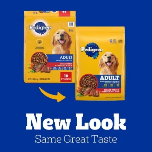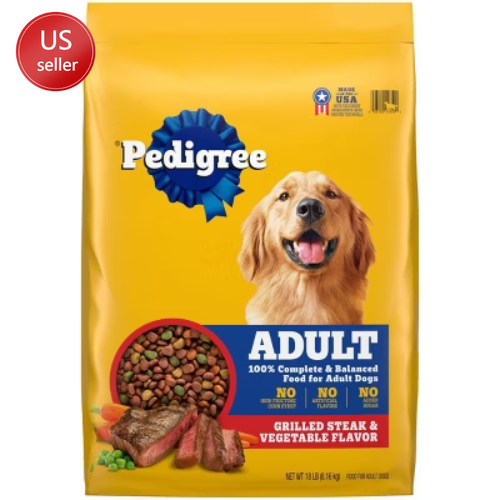 Description Dogs bring out the good in us. Pedigree brings out the good in them. Express your love for your dog by serving Pedigree Complete Nutrition Adult Dry Dog Food, Grilled Steak & Vegetable Flavor. This 100% complete and balanced adult dry dog food recipe is great-tasting and contains whole grains, protein, and accents of vegetables, bringing your dog a meal with quality nutrition that keeps them happy. To support your dog’s health and vitality, this dry dog food recipe is formulated with 36 vitamins, minerals, and amino acids. It also contains Omega 6 Fatty Acid and Zinc to help nourish a healthy skin and coat. With no high fructose corn syrup, artificial flavors, or added sugars, Pedigree Complete Nutrition Adult Dry Dog Food, Grilled Steak & Vegetable Flavor shows your dog that you care…and have great taste. highlights Great Tasting: Pedigree Complete Nutrition, Adult Dry Dog Food, Grilled Steak & Vegetable Flavor is a great-tasting dry dog food recipe with whole grains, protein, and accents of vegetables. Quality Nutrition: This dry dog food recipe is made with 36 vitamins, minerals, and amino acids to support your dog’s health and vitality; Crafted with no high fructose corn syrup, artificial flavors, or added sugar. Supports Healthy Skin and Coat: This dry dog food recipe is enriched with Omega 6 Fatty Acid and Zinc to help nourish a healthy skin and coat. Complete and Balanced: Pedigree Complete Nutrition Adult Dry Dog Food, Grilled Steak & Vegetable Flavor is 100% complete and balanced food for adult dogs, bringing a nutritious meal to your pet. Make it a Merry Pet Christmas for your pet with flavors crafted for holiday joy! Deck the bowls and fill them with our real steak and beef ingredients! Contains one (1) 18 lb. Bag of Pedigree Complete Nutrition Adult Dry Dog Food, Grilled Steak & Vegetable Flavor. Ingredients: ground whole grain corn, meat and bone meal, soybean meal, animal fat (source of omega 6 fatty acids [preserved with bha and citric acid]), ground whole grain wheat, corn protein meal, natural flavor, dried plain beet pulp, salt, bha (preservative), citric acid (preservative), potassium chloride, choline chloride, dl-methionine, calcium carbonate, dried peas, natural grilled steak flavor, zinc sulfate, vitamin e supplement, l-tryptophan, red 40, dried carrots, yellow 6, niacin supplement (vitamin b3), blue 2, d-calcium pantothenate (vitamin b5), copper sulfate, sodium selenite, potassium iodide, yellow 5, vitamin a supplement, riboflavin supplement (vitamin b2), vitamin b12 supplement, thiamine mononitrate (vitamin b1), vitamin d3 supplement, pyridoxine hydrochloride (vitamin b6), folic acid.
