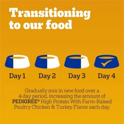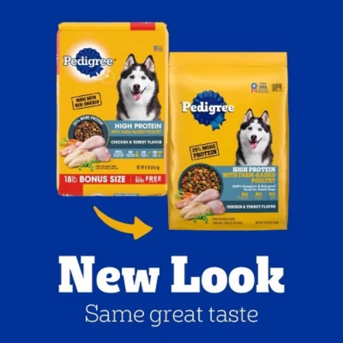 Important Note for Our Valued Customers: To offer you the best prices with free shipping, we occasionally experience shipping delays. If this happens, we’ll notify you immediately, issue a full refund, and invite you to place a new order at your convenience. To keep costs low, we sometimes reuse branded packaging boxes for shipments—we appreciate your understanding if you receive your order in repurposed packaging. Rest assured, all products we sell are 100% brand new, unopened, and freshly manufactured, including pet food and human-grade items, with a minimum 8-month shelf life remaining. If any issues arise, please contact us first—we’re committed to resolving them quickly. If you’re not completely satisfied, we offer a full refund with no hassle. Thank you for your trust and support! Description Dogs bring out the good in us. Pedigree brings out the good in them. Express your love for your dog by serving Pedigree High Protein Adult Dry Dog Food, Chicken and Turkey Flavor recipe. This great-tasting dry dog food recipe is made with real chicken and contains whole grains, protein, and accents of vegetables so you can feel confident that your dog is getting a high-quality meal. To support your dog’s health and vitality, this dry dog food recipe is formulated with 36 vitamins, minerals, and amino acids. It also contains Omega 6 Fatty Acid and Zinc to help nourish a healthy skin and coat. With no high fructose corn syrup, artificial flavors, or added sugars, Pedigree High Protein Adult Dry Dog Food, Chicken and Turkey Flavor shows your dog that you care…and have great taste. highlights Made with Real Chicken: This dry dog food recipe is made with real chicken and has 25% more protein compared to Complete Adult Nutrition, giving your dog a familiar flavor it will love. Great Tasting: Pedigree High Protein Adult Dry Dog Food, Chicken and Turkey Flavor is a great-tasting recipe with whole grains, protein, and accents of vegetables. Quality Nutrition: This dry dog food recipe is made with 36 vitamins, minerals, and amino acids to support your dog’s health and vitality. Supports Healthy Skin and Coat: This dry dog food recipe is enriched with Omega 6 Fatty Acid and Zinc to help nourish a healthy skin and coat. Quality Recipe: This dry dog food recipe is crafted with no high fructose corn syrup, artificial flavors, or added sugar. Contains one (1) 18 lb. Bag of Pedigree High Protein Adult Dry Dog Food, Chicken and Turkey Flavor. Amount : % Daily Value* Crude Protein (Min) 27% Crude Fat (Min) 12% Crude Fiber (Max) 4% Moisture (Max) 12% Linoleic Acid (Min) 2% Calcium (Ca) (Min) 1% Phosphorus (P) (Min) 0.8% Zinc (Min) 80mg/kg Vitamin E (Min) 100IU/Kg * Percentage of Daily Values are based on a 2,000 calorie diet. Ingredients: ground whole grain corn, meat and bone meal (source of calcium), chicken by-product meal (source of glucosamine and chondroitin sulfate), corn gluten meal, animal fat (source of omega 6 fatty acids [preserved with bha & citric acid]), soybean meal, ground whole grain wheat, chicken, natural flavor, dried plain beet pulp, salt, brewers rice, potassium chloride, calcium carbonate, choline chloride, dried peas, dl-methionine, natural turkey flavor, vitamin e supplement, monocalcium phosphate, zinc sulfate, yellow 6, dried carrots, yellow 5, l-tryptophan, blue 2, niacin [vitamin b3], red 40, d-calcium pantothenate [source of vitamin b5], copper sulfate, vitamin a supplement, sodium selenite, potassium lodide, riboflavin supplement [vitamin b2], vitamin b12 supplement, thiamine mononitrate [vitamin b1], vitamin d3 supplement, pyridoxine hydrochloride [vitamin b6], folic acid