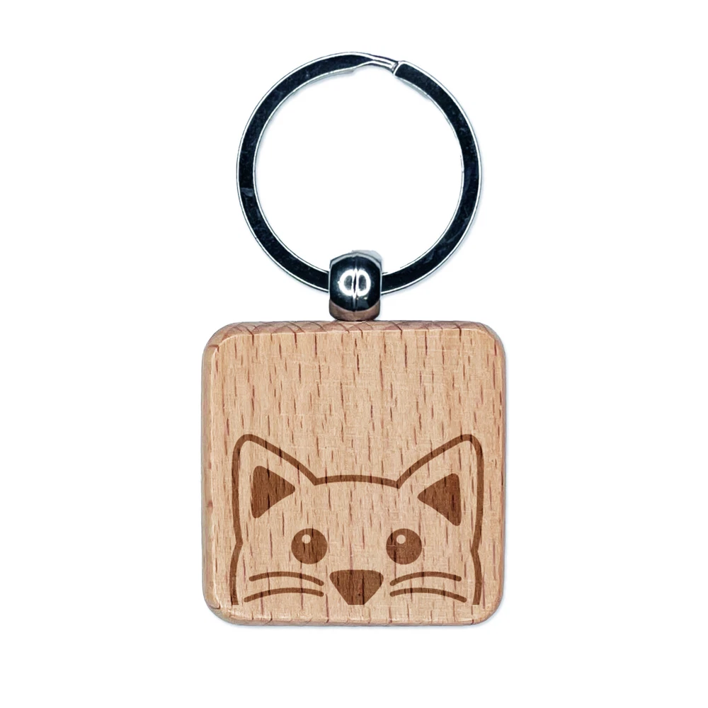 Peeking Cat Engraved Wood Square Keychain Tag Charm