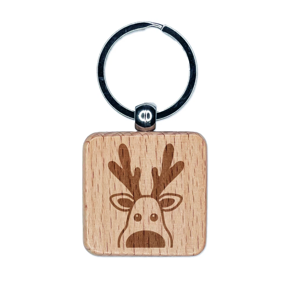 Peeking Reindeer Christmas Engraved Wood Square Keychain Tag Charm
