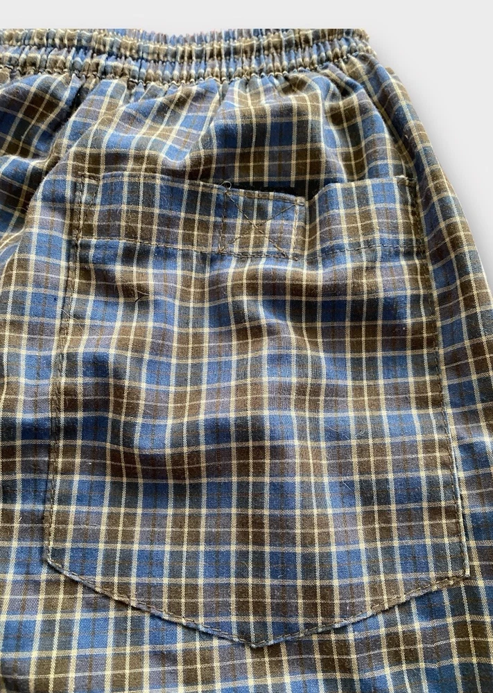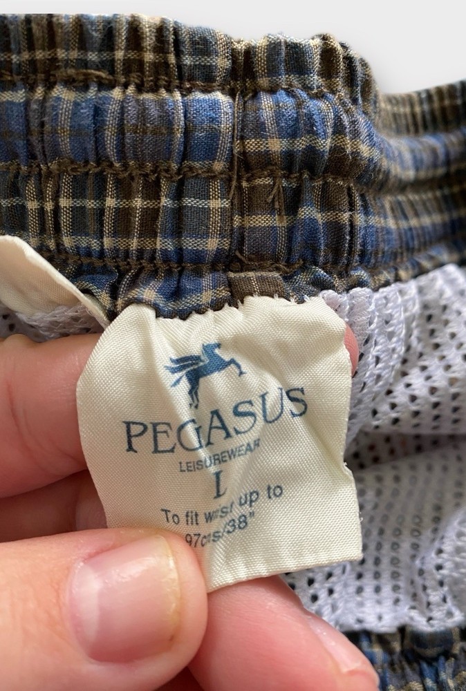 The Pegasus Swim Trunks in Men's size Large are a stylish and functional choice for your next beach outing. The blue plaid pattern adds a touch of personality, while features like an elastic waist, quick-dry fabric, and pockets ensure you stay comfortable and practical while in the water. Whether you're lounging by the pool, swimming in the ocean, or just enjoying some time by the lake, these swim trunks are a great choice for any water activities. Easy to care for with machine washable instructions, these trunks are a must-have for your summer wardrobe.