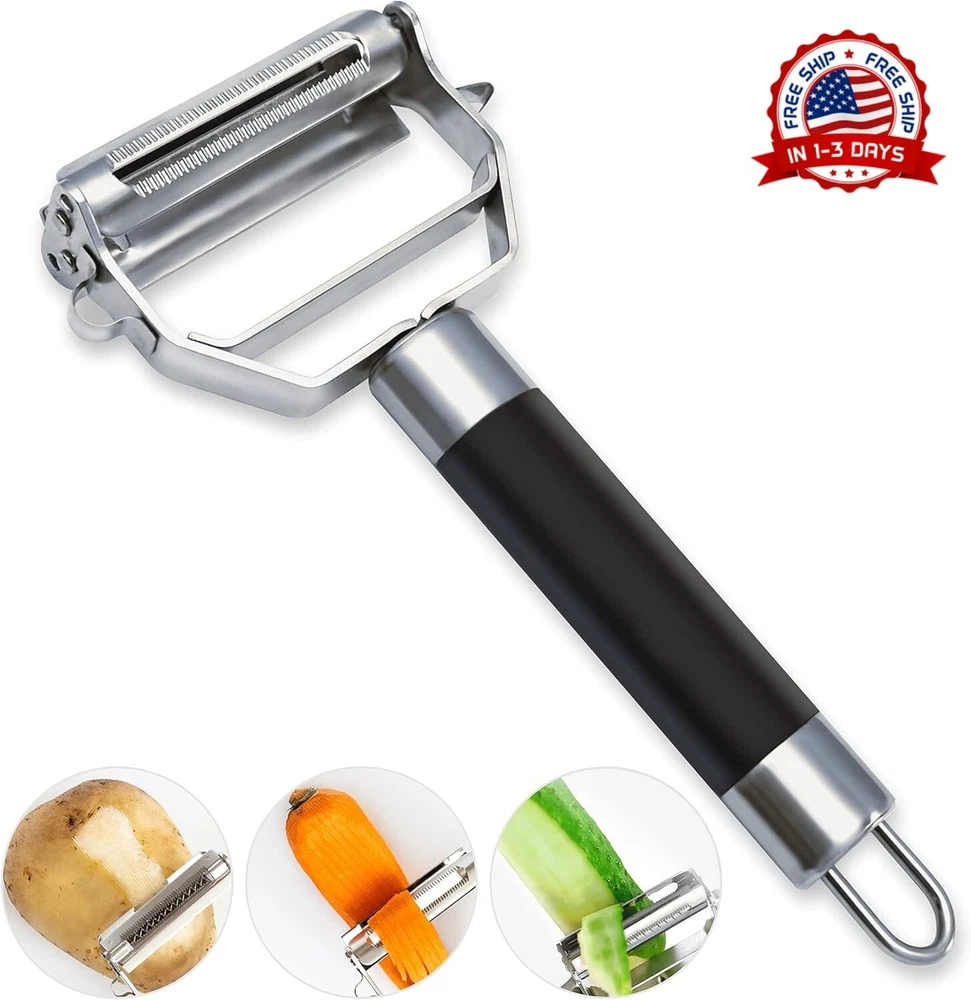Pelador de verduras multifuncional Zanahoria Patata Fruta Slicer ✅ AFILADO EXTRAORDINARIO Y MULTIFUNCIONAL: pelador de cítricos, cortador en juliana, cuchillo y cortador de patatas es una herramienta todo en uno. Pelar, cortar y cortar en juliana nunca ha sido tan sencillo. Las cuchillas de acero inoxidable se deslizan fácilmente incluso a través de las verduras más duras. ¡Un dispositivo se puede utilizar como pelador de pepinos, cortador de pepinos, pelador de zanahorias e incluso pelador de cítricos! ✅ CÓMODO DE USAR Y FABRICADO PARA DURAR: los peladores de verduras para cocina están fabricados con acero inoxidable de alta calidad que no se oxidará y durará muchos años. El cómodo mango antideslizante del cortador de juliana proporciona un agarre firme incluso si sus manos están mojadas o aceitosas. El pelador y rebanador de manzanas con revestimiento suave alivia la presión de tu mano, por lo que no te cansarás mientras pelas. ✅ COMPACTO Y APTO PARA LAVAVAJILLAS: ahorre espacio en la cocina reemplazando el voluminoso pelador de verduras eléctrico y las herramientas y aparatos de cocina difíciles de limpiar por un solo pelador de frutas. Cabe fácilmente en cualquier cajón o se puede colgar usando el lazo del mango. Para lavar el pelador de limón simplemente pásalo bajo el chorro de agua. También es apto para lavavajillas. ✅ MEJORA TU COCINA CON INFINITAS OPORTUNIDADES DE PLATOS: sorprende a tus amigos con nuevas recetas similares a las de un restaurante y haz que tu cocina diaria sea entretenida. Decorar tus platos con guarniciones de aspecto delicioso, hacer fideos de calabacín, ensalada de papas, zanahorias ralladas, cortar verduras y frutas para ensaladas saludables, cortar papas fritas y queso, quitar la piel de la manzana o la naranja: es muy fácil con el pelador y cortador de zanahorias de cocina. Rallador de zanahorias