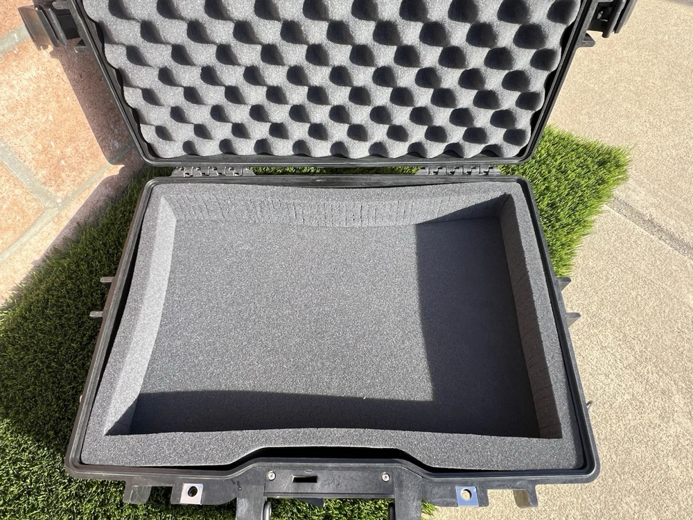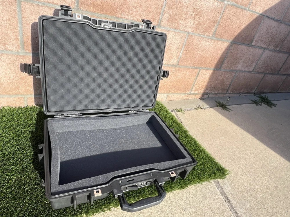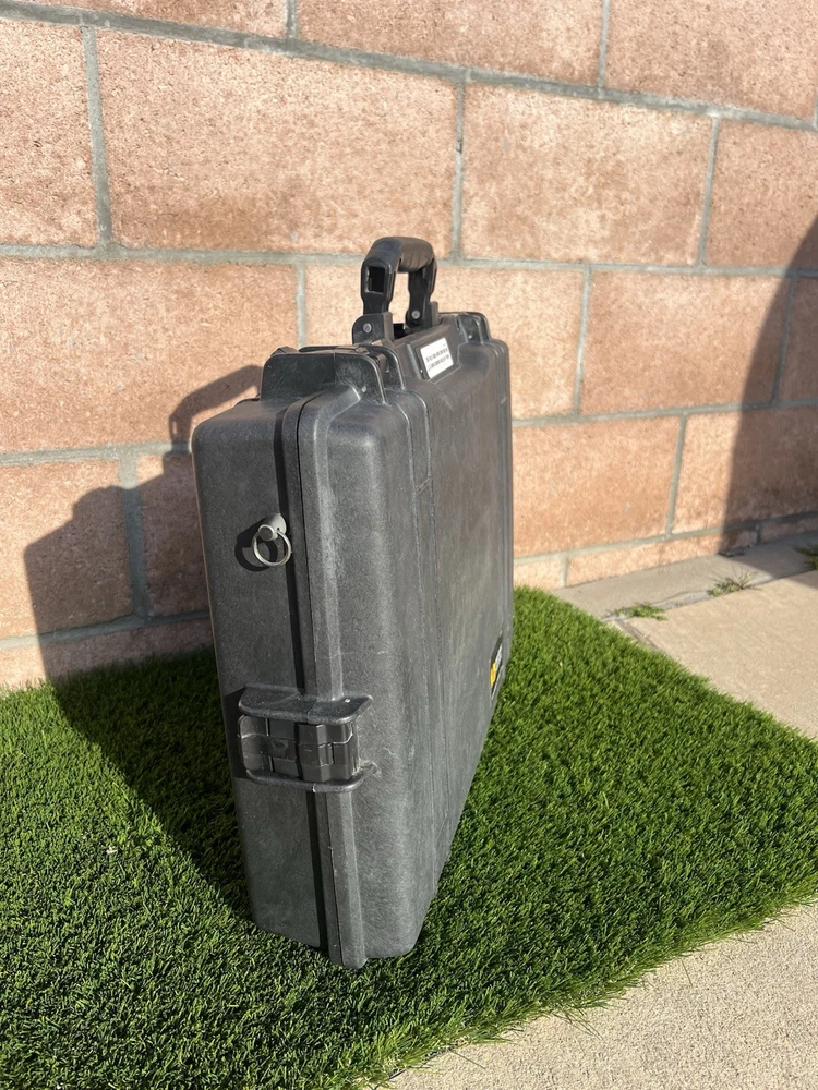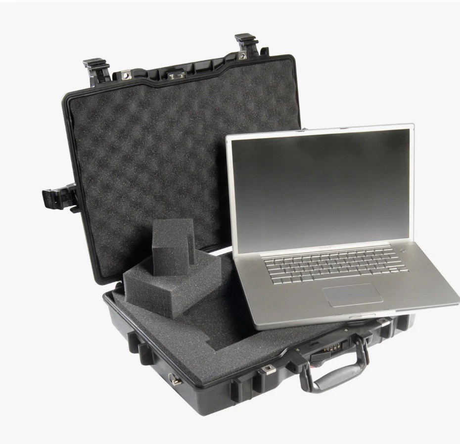 Pelican 1495 Laptop Case (Black) Waterproof Shockproof Hardcase W/ Foam Insert All are In great shape The outside has some light surface marks but the inside is immaculate. Some of the marks on each case may differ slightly but are all in the same shape. Comes with paper instructions on how to set the combo lock. All of the latches and locks function perfectly. Does not come with the original nylon shoulder strap. Ships out same or next day. Has original top and bottom foam but it is not glued so if u wanted to buy new phone and reconfigure it wont have the glue residue left behind. PREMIUM LAPTOP HARD CASE: Compatible with 17 inch laptops, MacBook Air, and select MacBook Pro models FEATURES: Watertight, crushproof, dustproof hard case design, customizable Pick N Pluck foam and convoluted lid foam. Includes 3 dial combination lock, padded shoulder strap, rubber over-mold handle, and O-Ring seal and pressure equalization valve DIMENSIONS (LxWxH Inches): Exterior 21.62 x 17.25 x 4.87 | Interior 18.87 x 13.12 x 3.81 - Weight 8.37 lbs MADE IN USA: Trusted protection in use by the military, divers, first responders (fire, police, EMT) since 1976 Fits up to 17" laptopF Watertight, crushproof, and dust proof Fold down over molded handle Automatic Pressure Equalization Valve