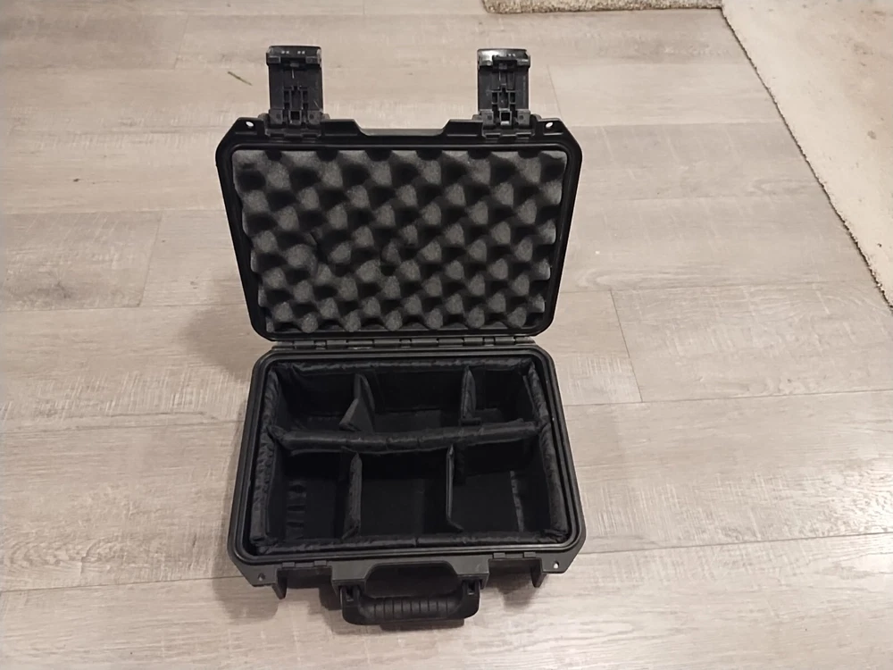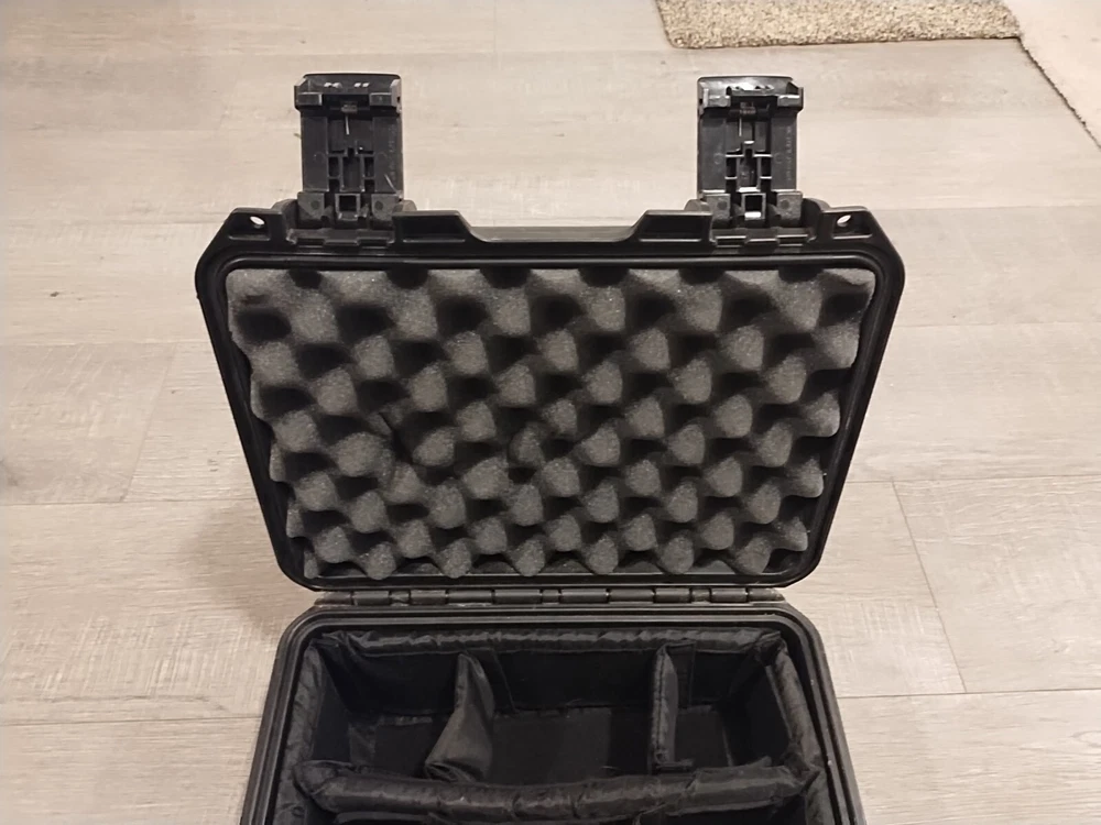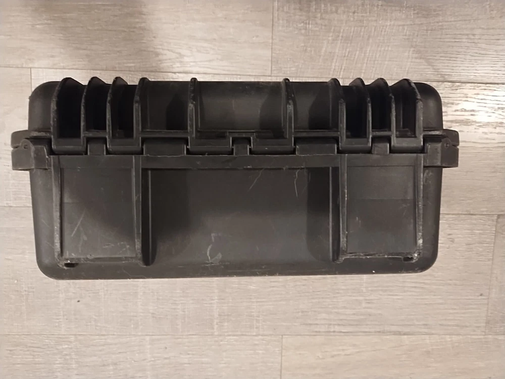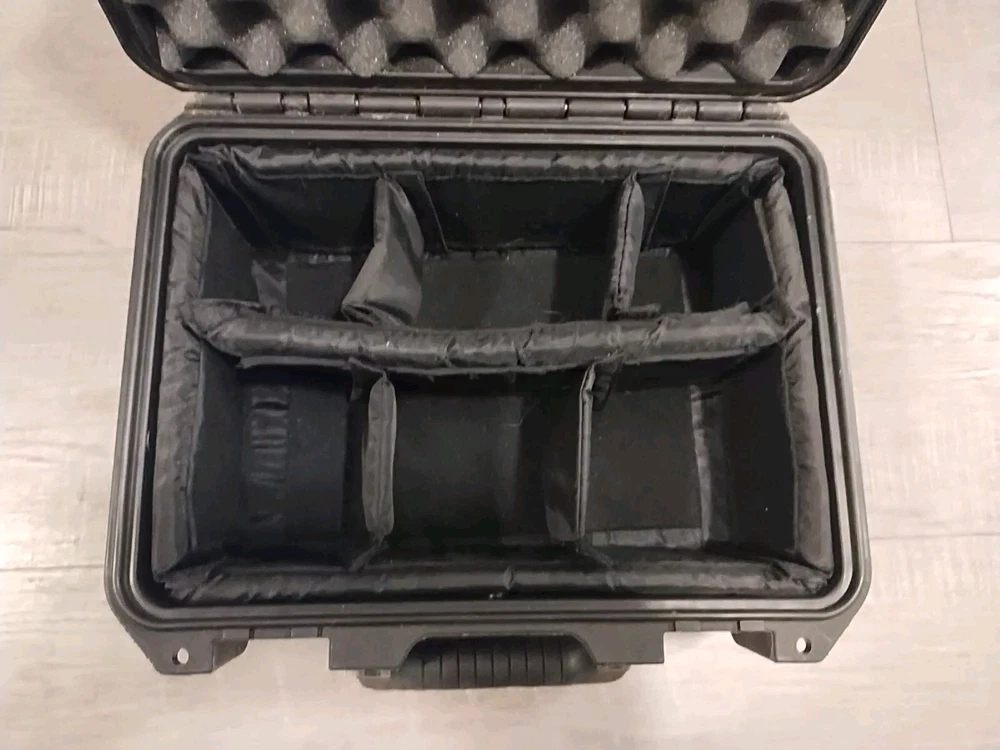 The Pelican Storm Case in Black is a hard case made of rigid plastic, specifically designed to fit cameras. It features foam padding and adjustable dividers inside, providing excellent protection for your camera equipment. The exterior dimensions are 14x12x7 inches, making it a reliable and durable choice for safely storing and transporting your camera gear.